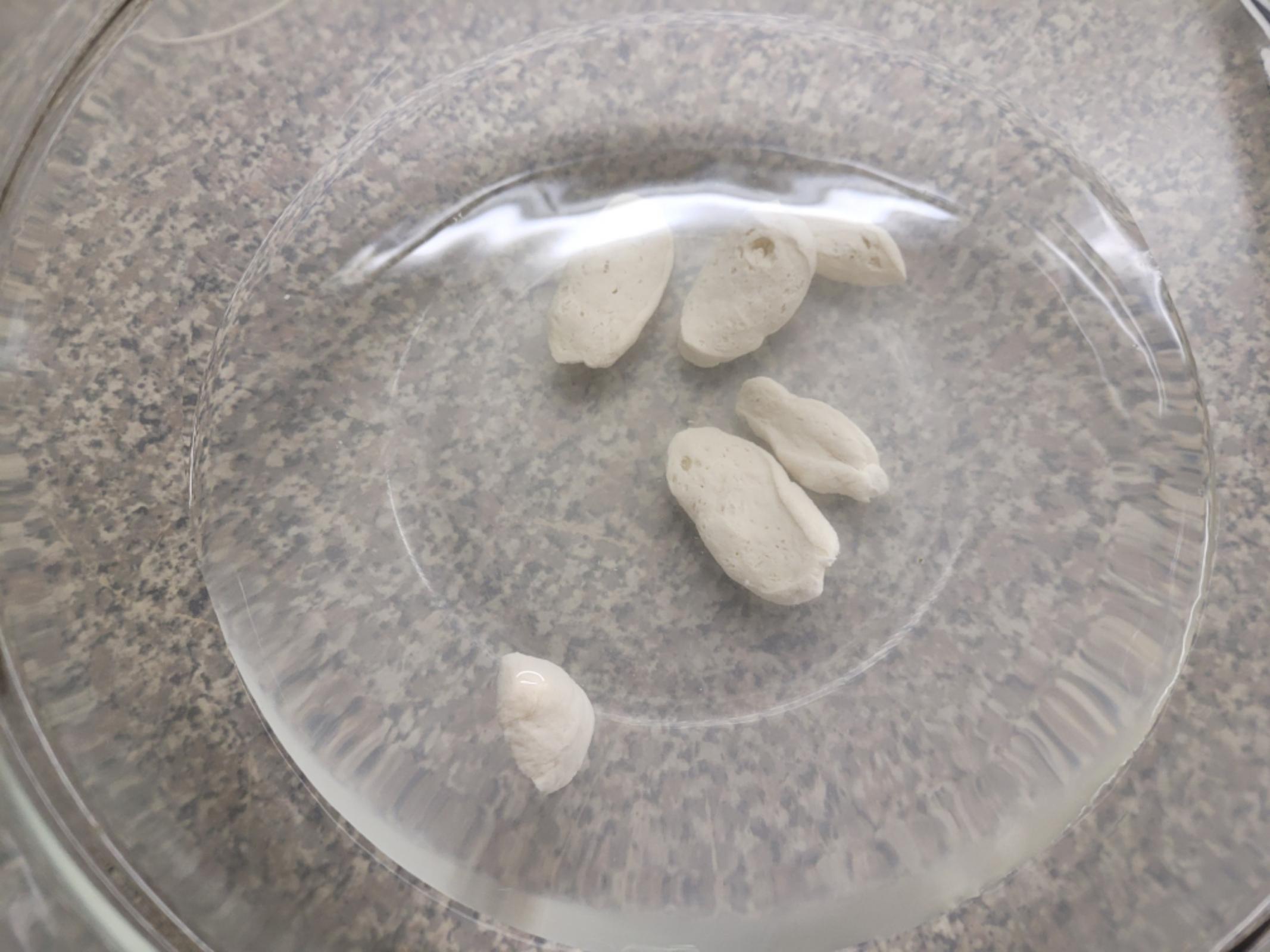 After cracking open the dry shell, the interior of the mother looks very promising! After shaving 50g from the center it goes straight into a 20-minute cool sugar bath.
