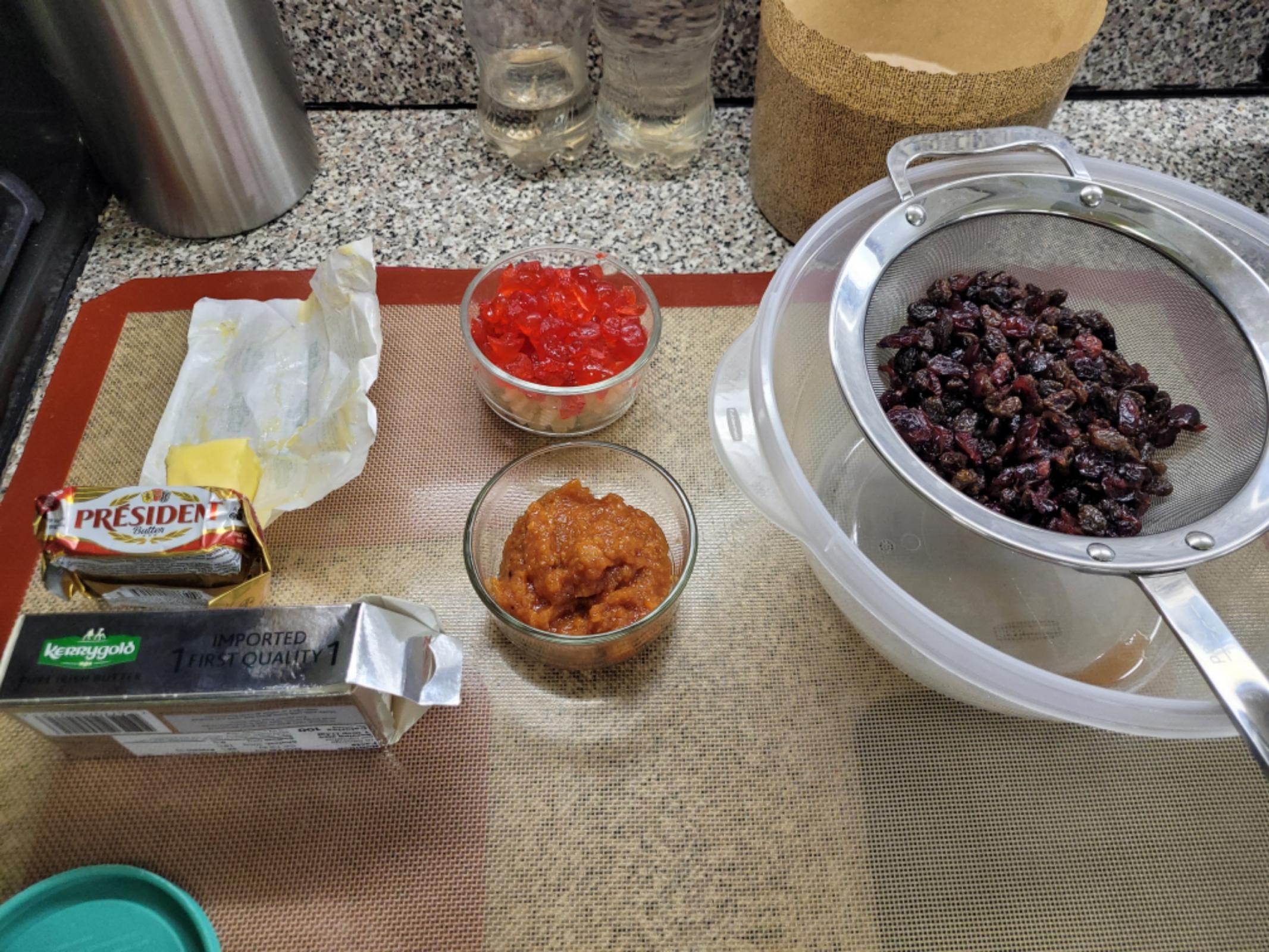 Still, hours to travel before home. The first build reached triple plus in about 5 hours. The second build is just about at the windowpane. Everything but the candied fruit is in the mix. The citrus paste I left until the dough was good and strong. It is incorporated without a hitch. This was a question mark because this was my addition to the formula. I used two different kinds of premium butter. the dough smells so good!