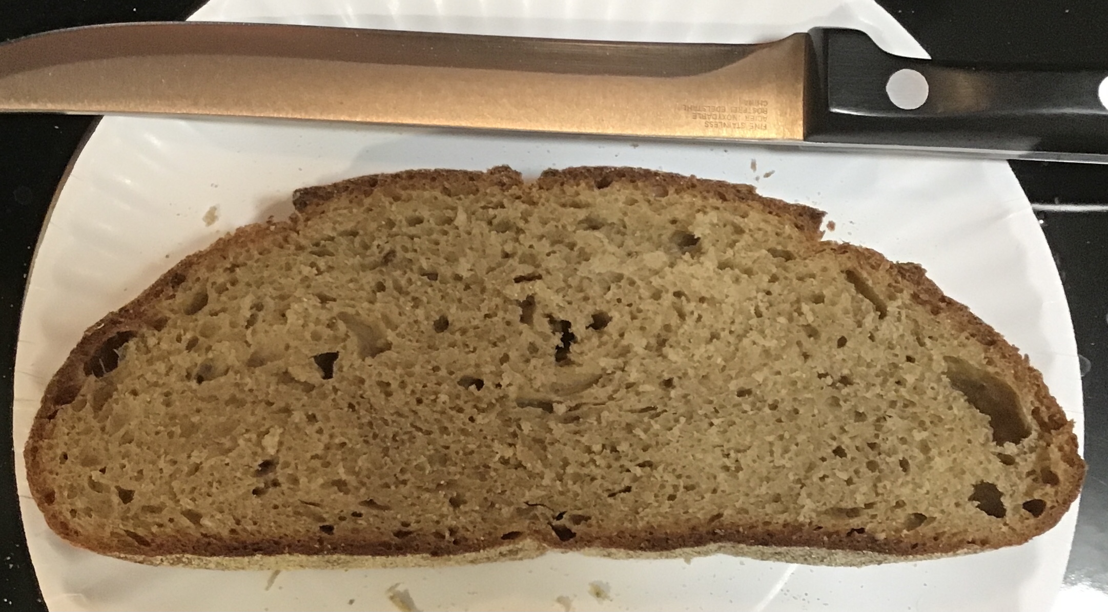 I cut it open around 8 am on Monday the 21st, so after about 37 hours of rest. As I expected from the short ferment+proof time, only 3 hours 37 minutes, the taste was kind of bland. The bread spice and caraway was barely noticeable.