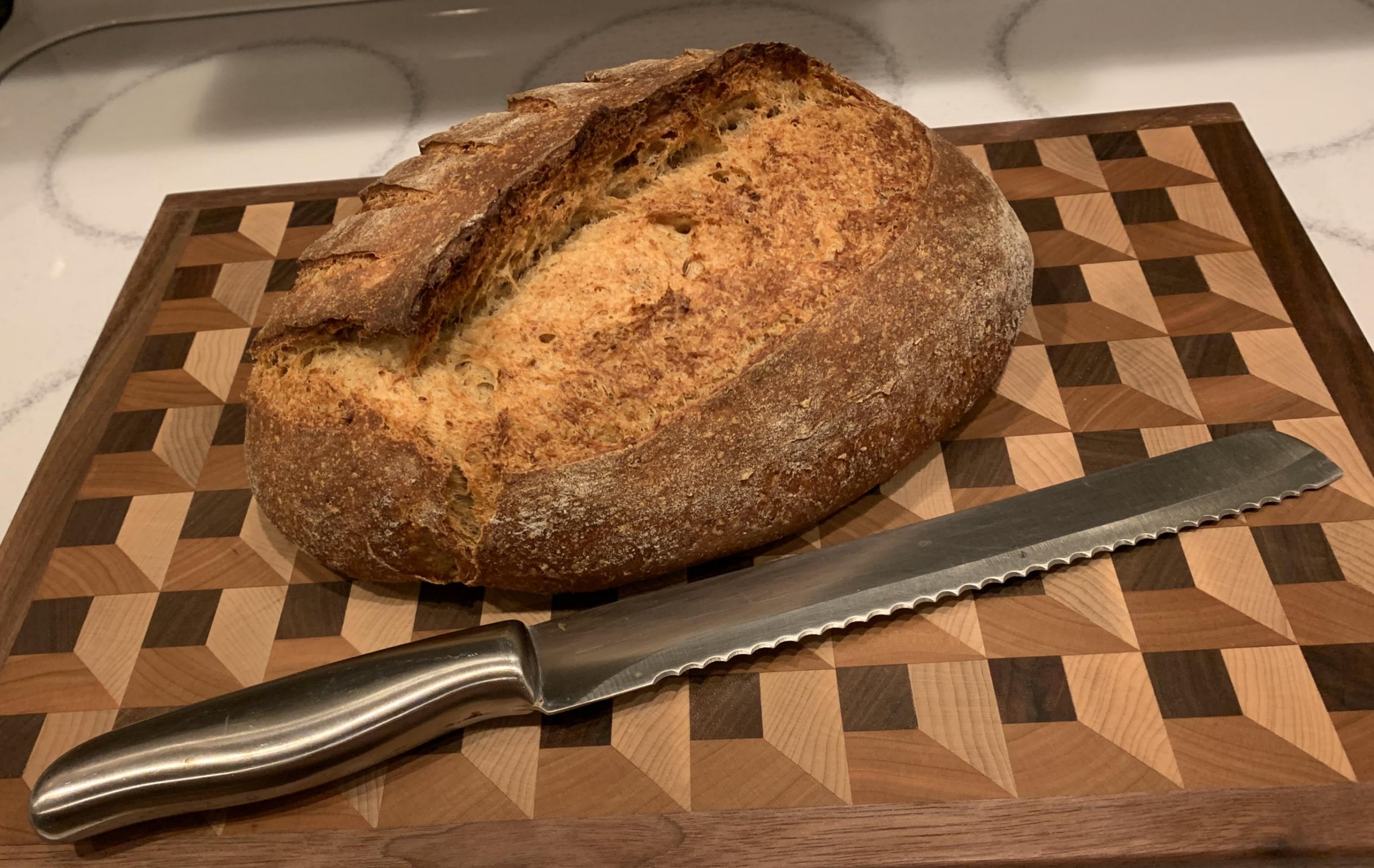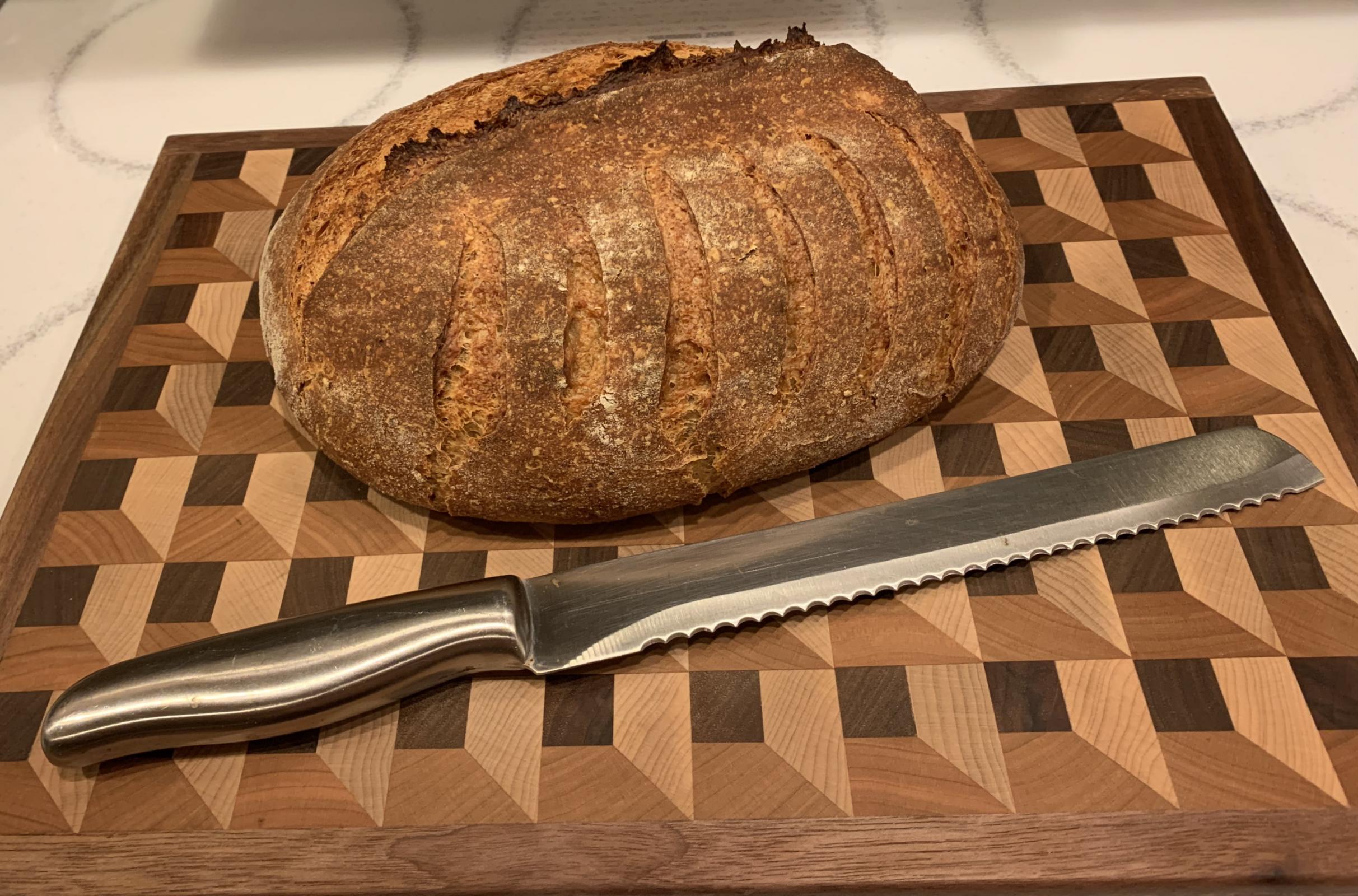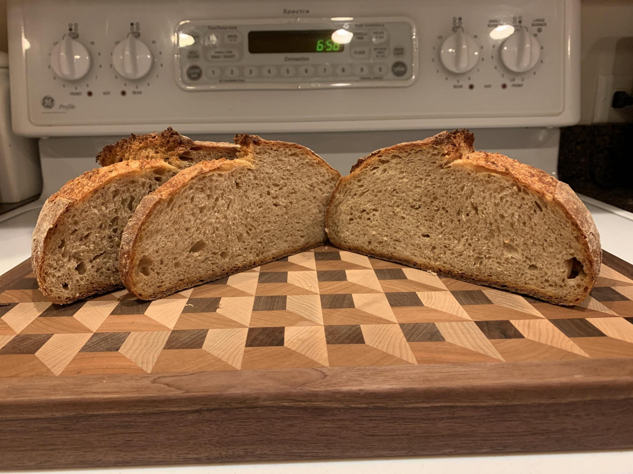 Scoring for this dough inspired by Isand66 and his recent bake. Seemed to work well. Got a nice ear and decent expansion. A little more spread than loft, but probably to be expected with 40% whole grain that has minimal gluten content. Crumb pictures tomorrow after giving it ~18 hours to cure.