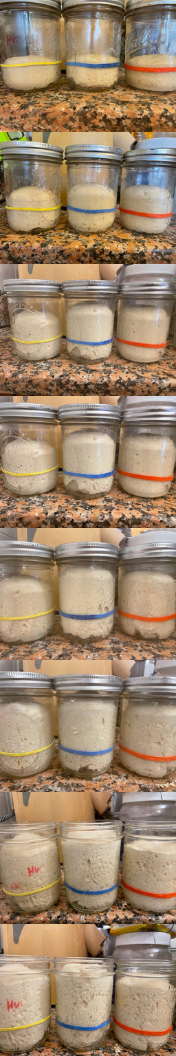 Of course there is a lot that could be improved here, but it is interesting that there were fairly similar, when considered in relation to the impact of dough handling and fermentation in an actual bake. I would guess the younger (12 hour pH 4.3) starter might have the potential to produce a slightly more aerated loaf, despite the slightly lower % PFF relative to the stiffer red version. They all started at the same height (same weight within a gram or so), but the initial photo was taken after initial signs of fermentation.