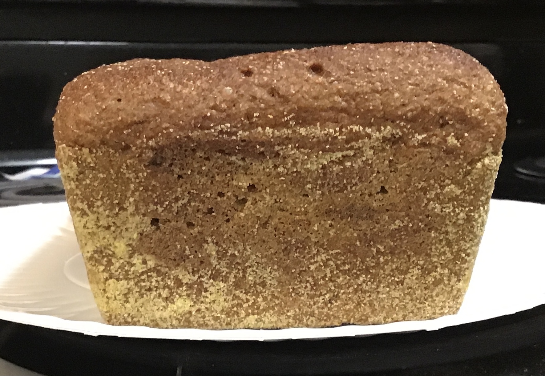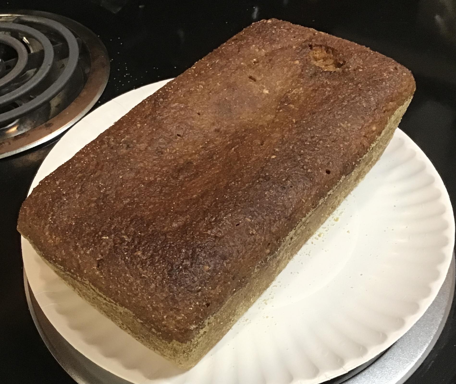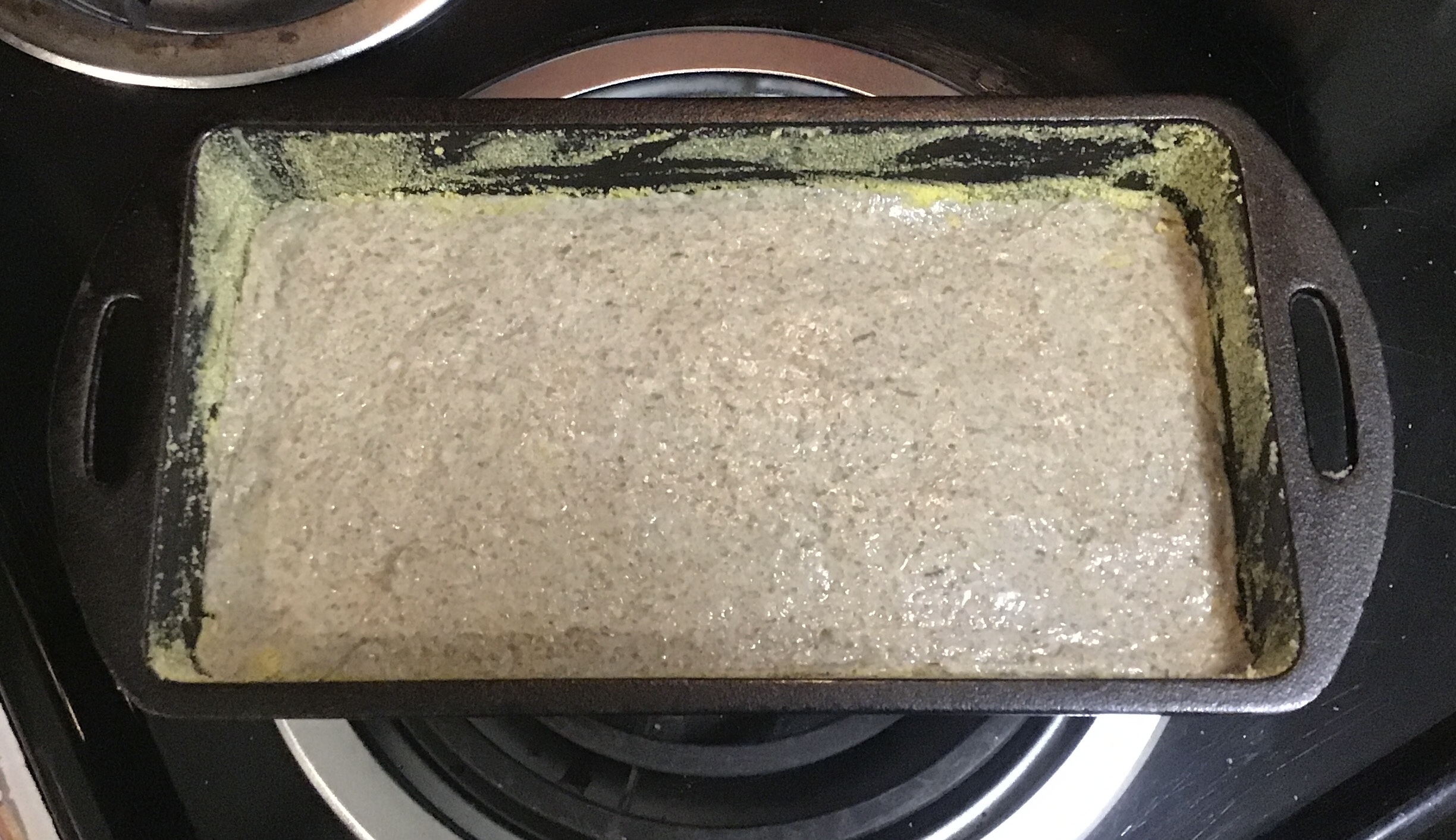 The Lodge cast iron loaf pan was greased with shortening, and dusted with cornmeal.