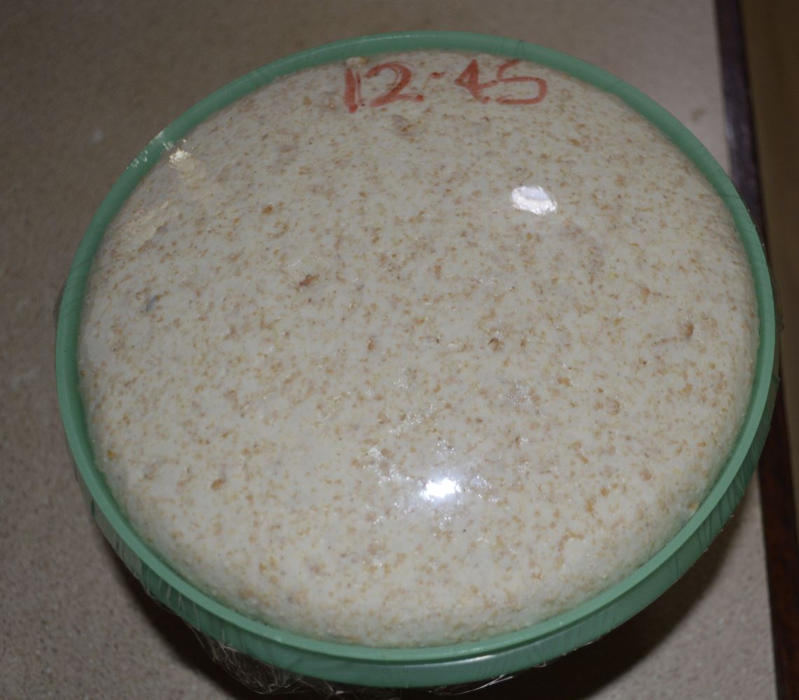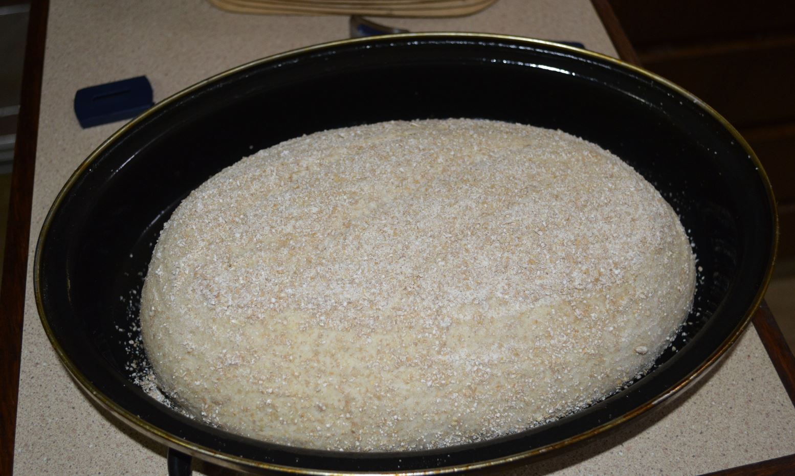More baking with the red wheat this time i milled the wheat with my kenwood and the intention was to make it 50% with millers single origin white flour which is rated at 12% protein. i had already soaked and sprouted some of the red wheat a couple of days earlier to the Chit stage and it was my intention to add this to the mix too that was a 20% addition. i put the sprouts through the liquidiser, i did need to add a bit of water to ensure the sprouts kept falling to the blades as initially they were getting hung up on the sides of the container. i mixed the dough in the noodle mixer for 15 minutes and a nice moist dough was attained i proofed it in my usual tupperware container. Well this dough kicked like a mule it raced through its bulk fermentation in an hour flat, definately reduce the yeast next time. i do believe though that the live grain mash contributes to the accelerated fermentation. the dough was meant to be 750 g but with the extra water that was required for the liquidising and a little extra flour i ended up with 800g. No matter The dough felt great and after handing up was allowed 15 minutes bench rest, i then shaped the dough to go into a Banneton that i floured with some of the bran that i sieved off of the milled red wheat. the dough was placed into a plastic bag and deposited into the fridge to slow it down a bit and to firm it up a little more . The dough was ready after an hour and was tipped out into a casserole pan that i had as it was bigger than my clay baker. it was scored and into a very hot oven with the cover on for the first 15 minutes and then the cover removed. the loaf was baked for 45 minutes. i was again pleased with the performance of the flours and the resulting loaf. freshly milled red winter wheat (ACCROC) 195g 50% ; Millers single origin white flour 195g 50% ; salt 8g 2%; malt extract 8g 2%; butter 8g 2% ; dried yeast 8g 2% ; sprouted red wheat liquidised 78g 20%; water 253g 65% ; dough weight should have been 753g but was actually 800 with the samll addition of water and subsequent flour. The loaf was very aromatic the crumb was excellent and nice and soft and the crust was chrisp and enhanced with the rolling in the red wheat bran and flour. i shall do another bake using only the red milled wheat flour, but my grinder is much coarser than Lachies so it should be interesting. I still have enough sprouts in the fridge to incorporate 20% again. yeast will be halved or even quartered i think