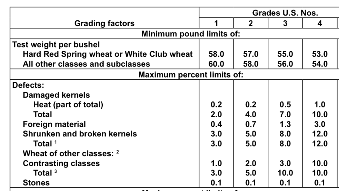 Unfortunately, the link to the usda PDF (with wheat grade specs) is no longer valid -- link rot. So you'll need to google or duck it: try: wheat grade specification table