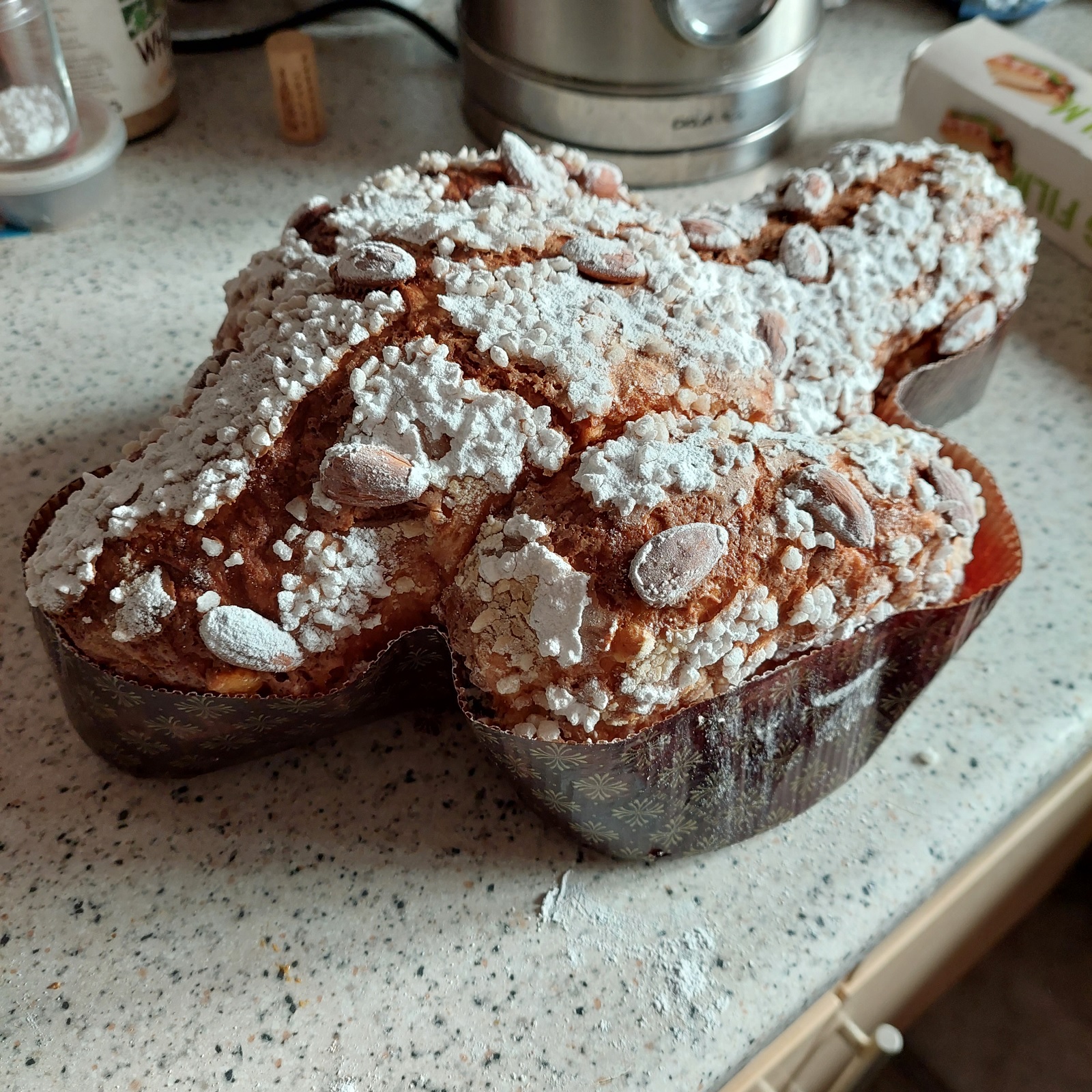 Top with whole almonds, sugar nibs and yes finally dust generously with icing (powdered) sugar.