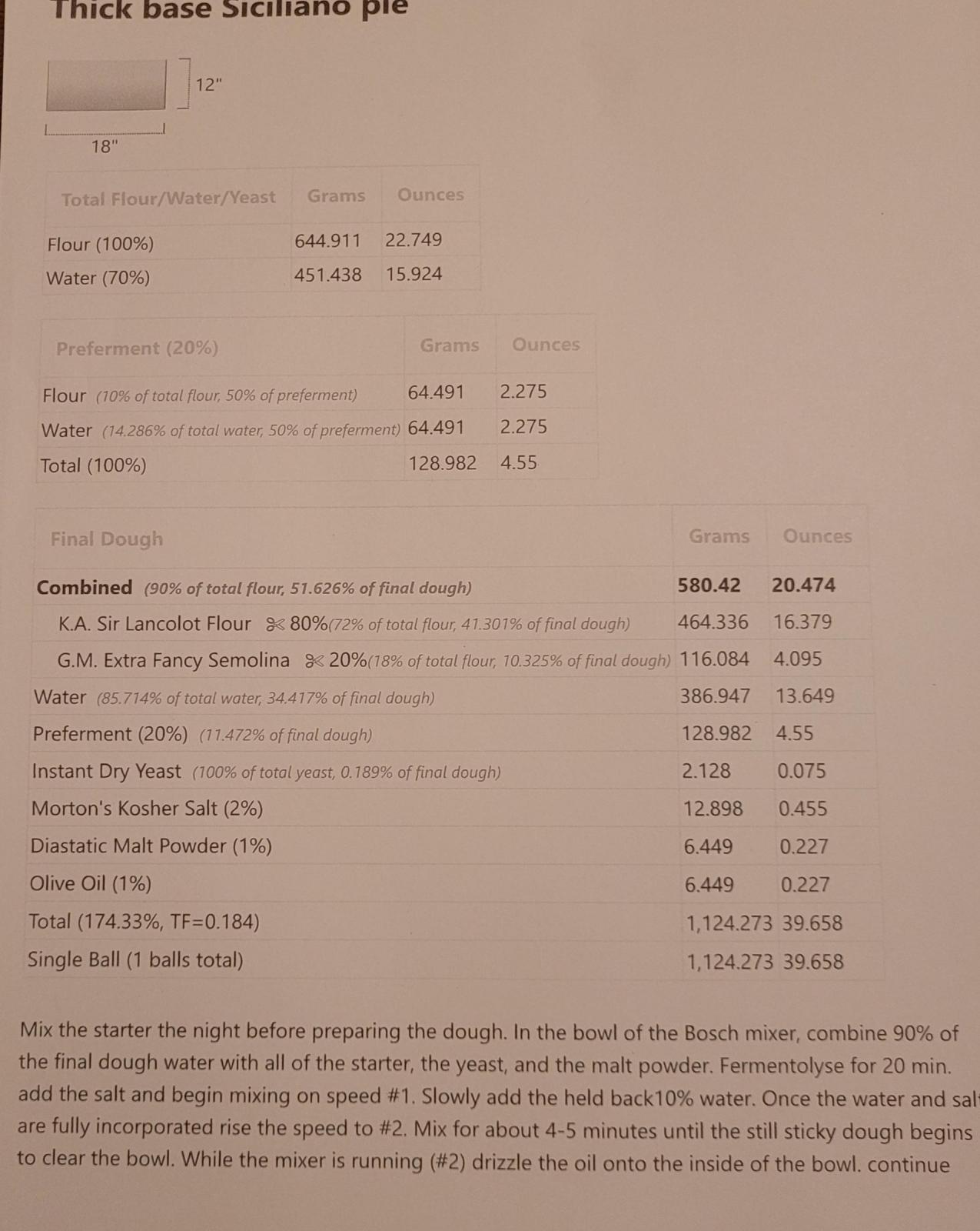I don't know if it's just me, however, I was having a very hard time following Tony Gemignani's formula for Sicilian pizza with poolish. I ended up doing what I always do. My own thing. I kept the 70% hydration and used my natural yeast starter for the poolish. This is what I came up with. I am looking at a Saturday afternoon bake.