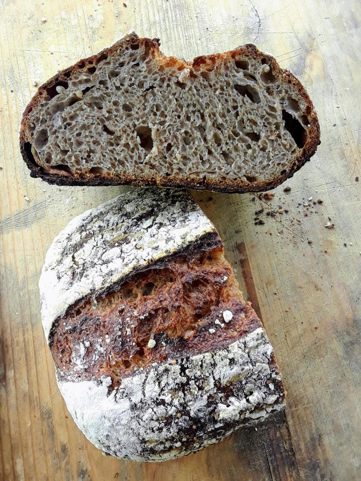 Upon taking loaves out of refrigerator Saturday morning, I was pretty sure that I had over proofed them, either too much fermentation before shaping or too long proofing after shaping OR maybe refrigerator warmes up too much while power was out.  Feeling them as I turned them out and scored them, they didn't feel awful, but the lack of oven spring clearly shows some manner of issue in the fermentation timing department, though the crumb is fairly consistent at least. Flavor is fine but nothing like the barley porridge loaf. More bitter flavor.