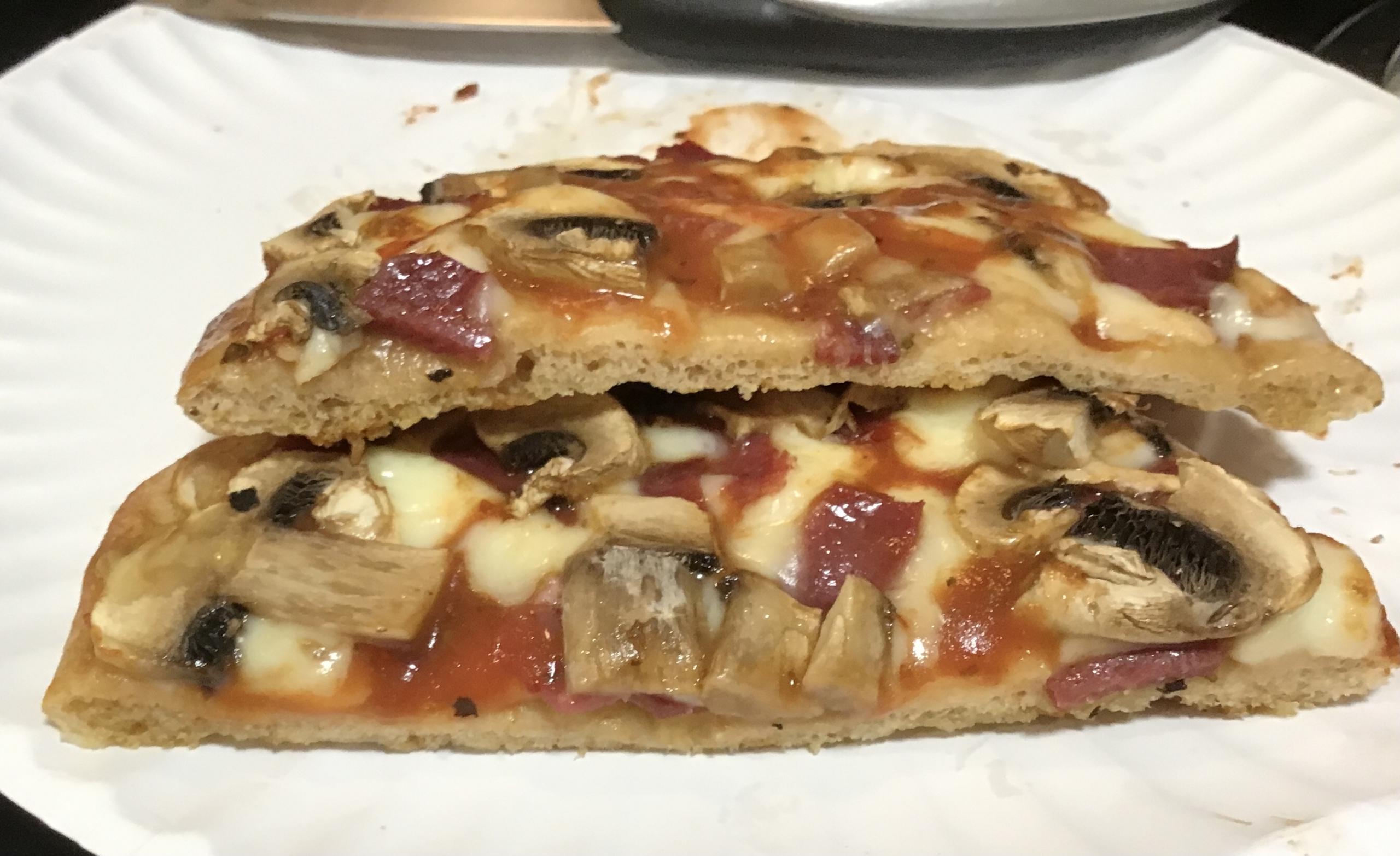 Toppings: mozzarella cheese, Alef brand beef dry salami, sliced fresh mushrooms.