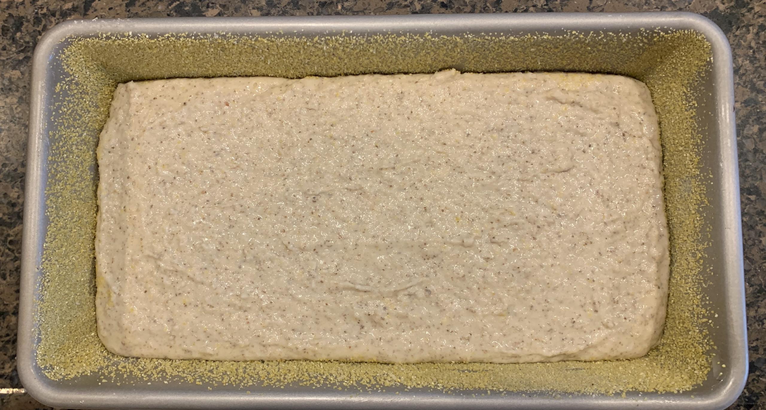 6) Butter (or grease) a 4"x8" bread pan and coat with brown rice flour or corn meal/polenta.