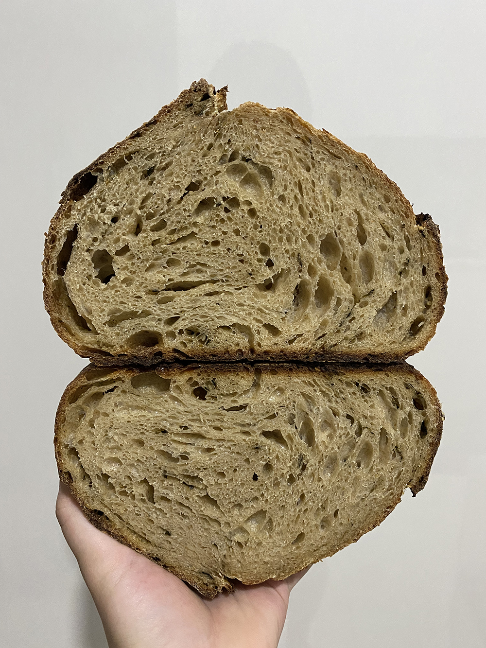 4 sets of coil folds during bulk fermentation. Added in the furikake at the 2nd fold. Took 7 hrs for bulk fermentation!