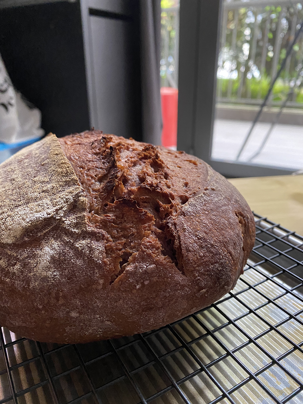 - Baked in dutch oven at 220C (lid on 20mins, lid off 30mins)
