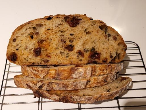Tasting Notes: Wow! The pine nuts, basil, and sunderied tomatoes all shine. the bread all by itself was super tasty. so much so that my first thought was that I would bake a loaf of this...cut it up...and then take it on a long plane flight. Doesn't need any toppings, spreads, or anything else. I could easily cut up the whole thing and eat it in one sitting with no regrets.