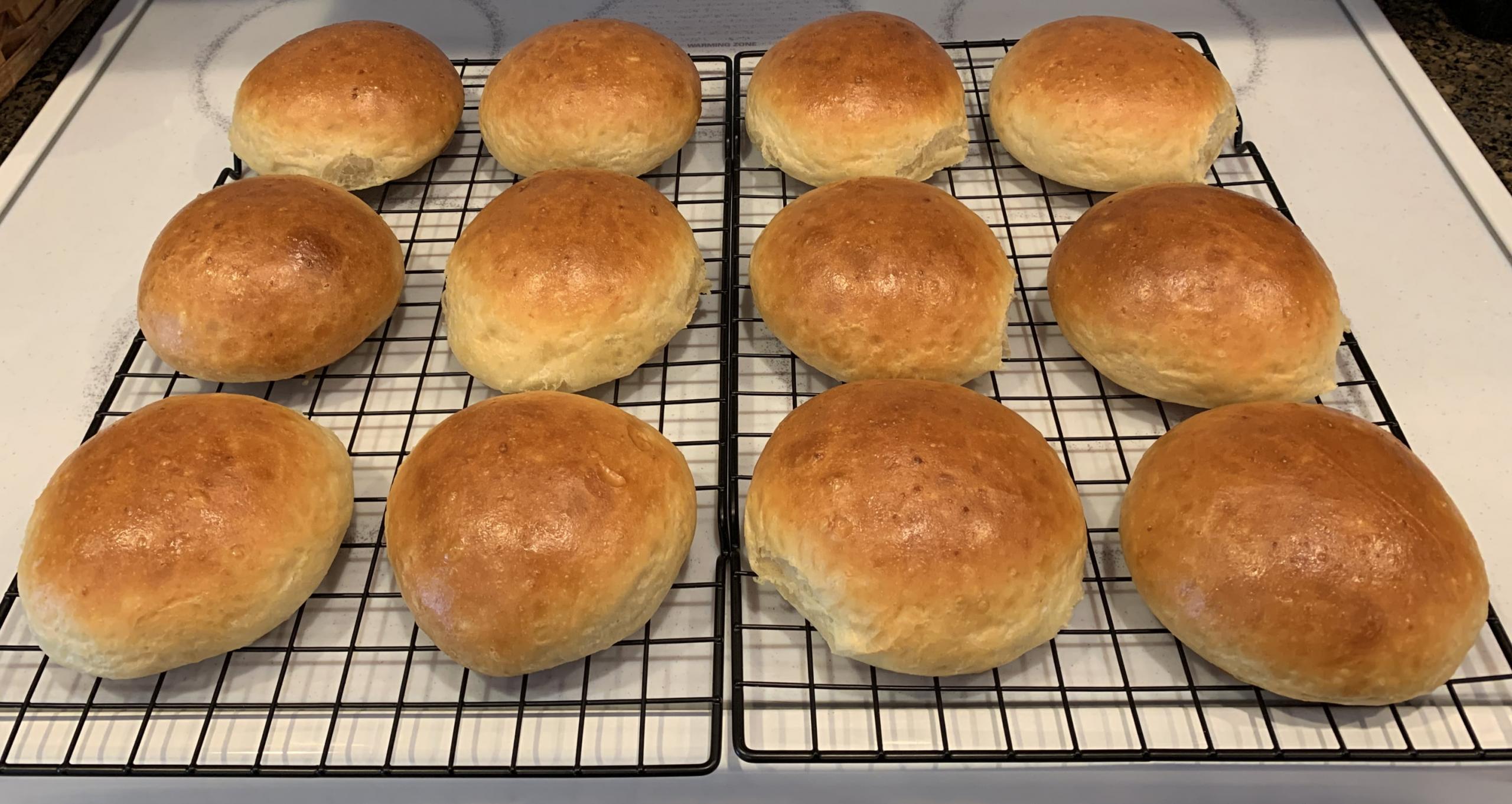 9)    Preheat oven at 350 deg F.  After final proof, apply egg wash to buns and bake at 350 deg F on center oven rack for 30 minutes (until golden brown).