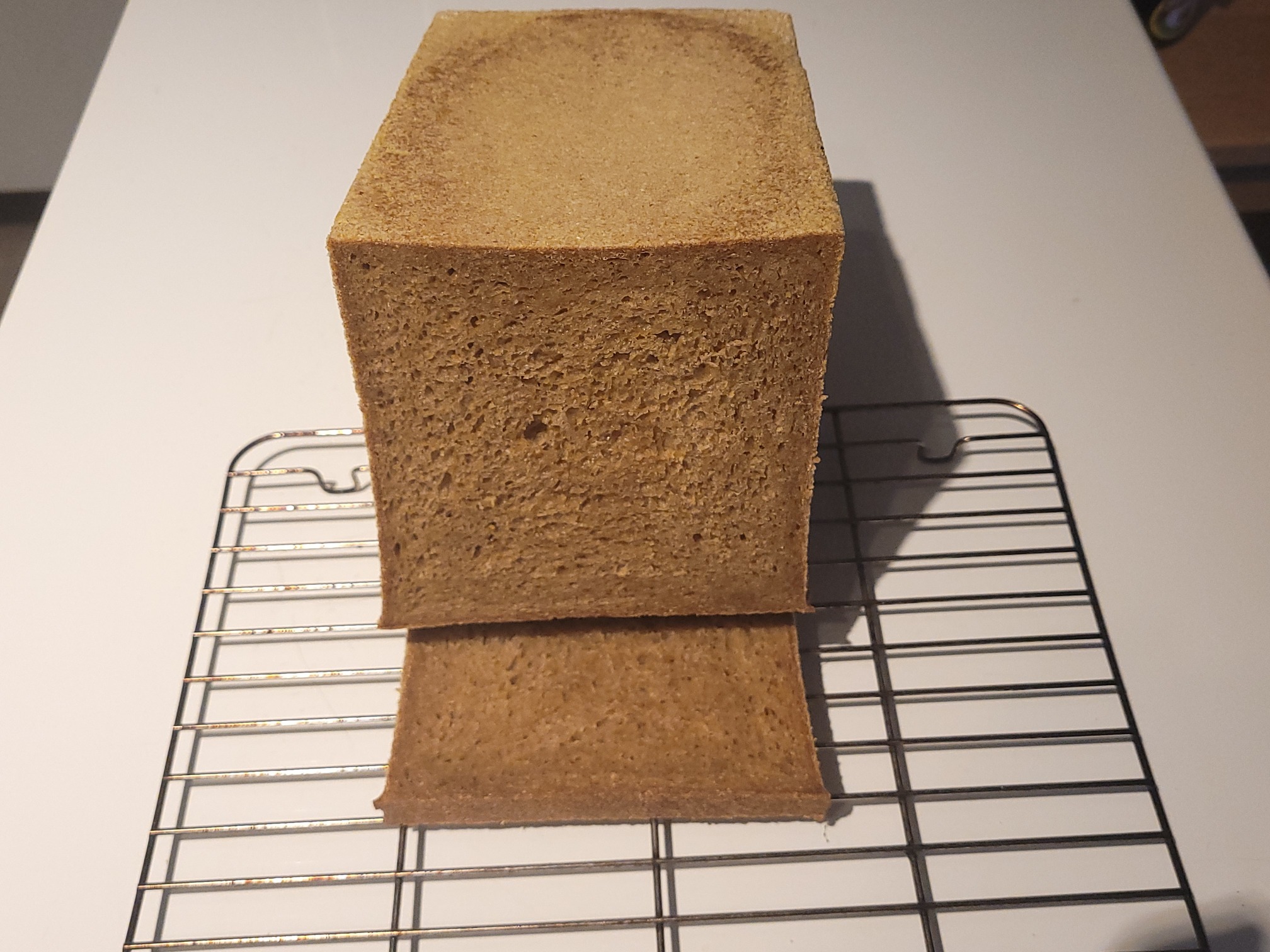I've made this a few times in the past and it's always been a light and fluffy loaf. Which in all honesty this should have been but instead I made the super dense anadama BRICK!  Basically instead of taking the recipe and dividing or scaling it properly I made it up and tossed it into my Pullman pan. Let it finish it's prove (which was enough to press on the lid) and baked it off. In hindsight it was probably too much dough and would have been better with less to get more of that fluffy result....but even as a dense bread it's delicious.