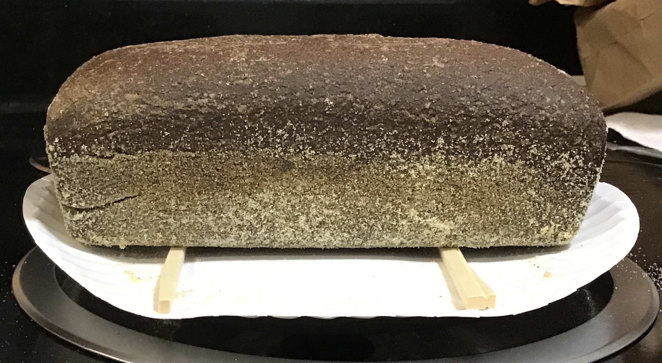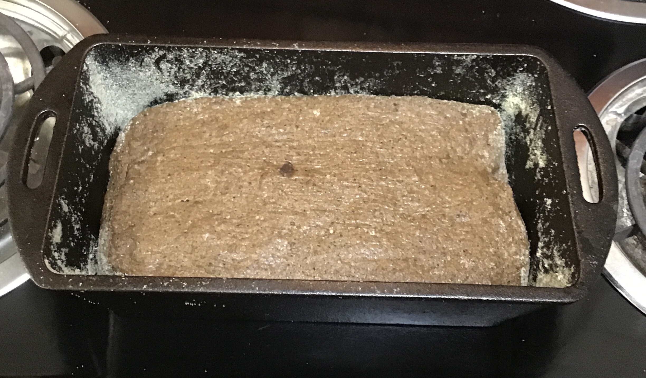 •   4:06 pm panned in a greased and dusted (melted Crisco & durum semolina) Lodge cast iron loaf pan, 4LP.