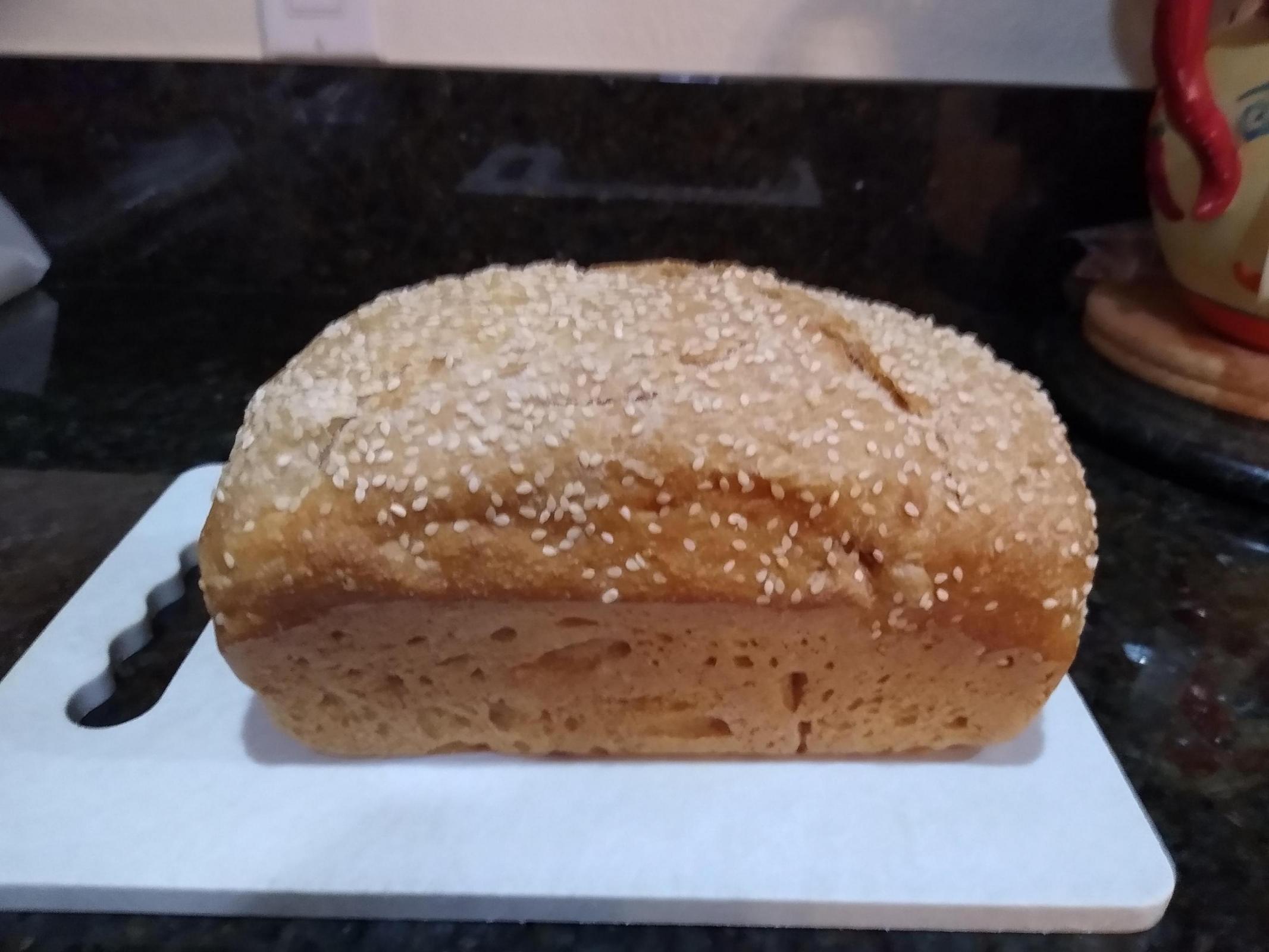 50/50 store bought whole wheat/bread flour, 80% hydration, about 40 gm of starter discard, 1/4 tsp of yeast, 9 gm salt, and a Tbsp of olive oil. Hand mixed, a couple of rounds of S&F and mostly ignored for 5 hours. "Shaped" (it was a bit wet for real shaping, so more like organized into a loaf pan configuration of sorts), sprinkled with sesame seeds, and proofed until it was about 3/4 in above the edge of the pan edge. Topped with another loaf pan as a lid and baked at 375 F. Lid off after 30 min, and watched it every 5 min or so. The crust looked good at 50 min. Other TFL members mentioned to bake to a lower internal temp than at sea level or risk having dried out bread, so I pulled it out at 197F internal temp.Â