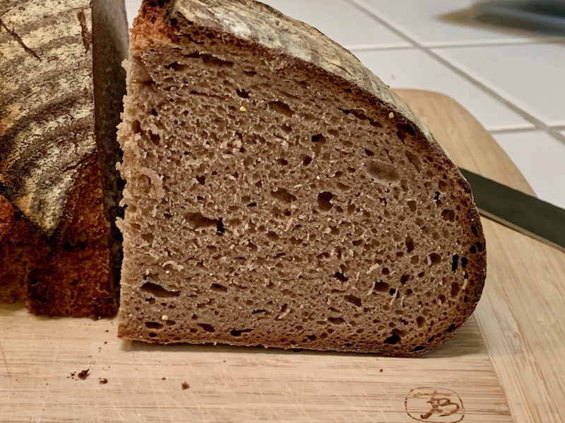 I have found that proofing high-hydration loaves and high-rye loaves in brotformen smaller than you would expect for the loaf's weight results in a higher loaf after baking. So, this 1100g loaf was proofed in a brotform ordinarily used for 500-700g boules. Hope that makes sense.