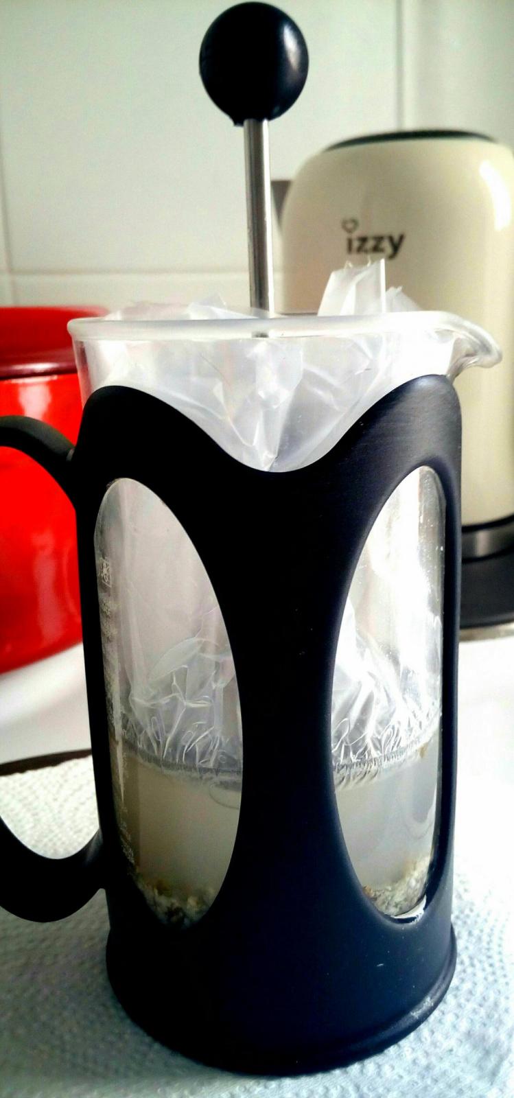 Then I pour 100g warm water (40-45C) over the strained grains plus small amount of acv (1/8tsp), stir and slowly but firmly squeeze the membrane down the cylindrical carafe with the plunger until it just touches the water surface. This ensures minimal exposure to air closely recreating anaerobic conditions during fermentation.