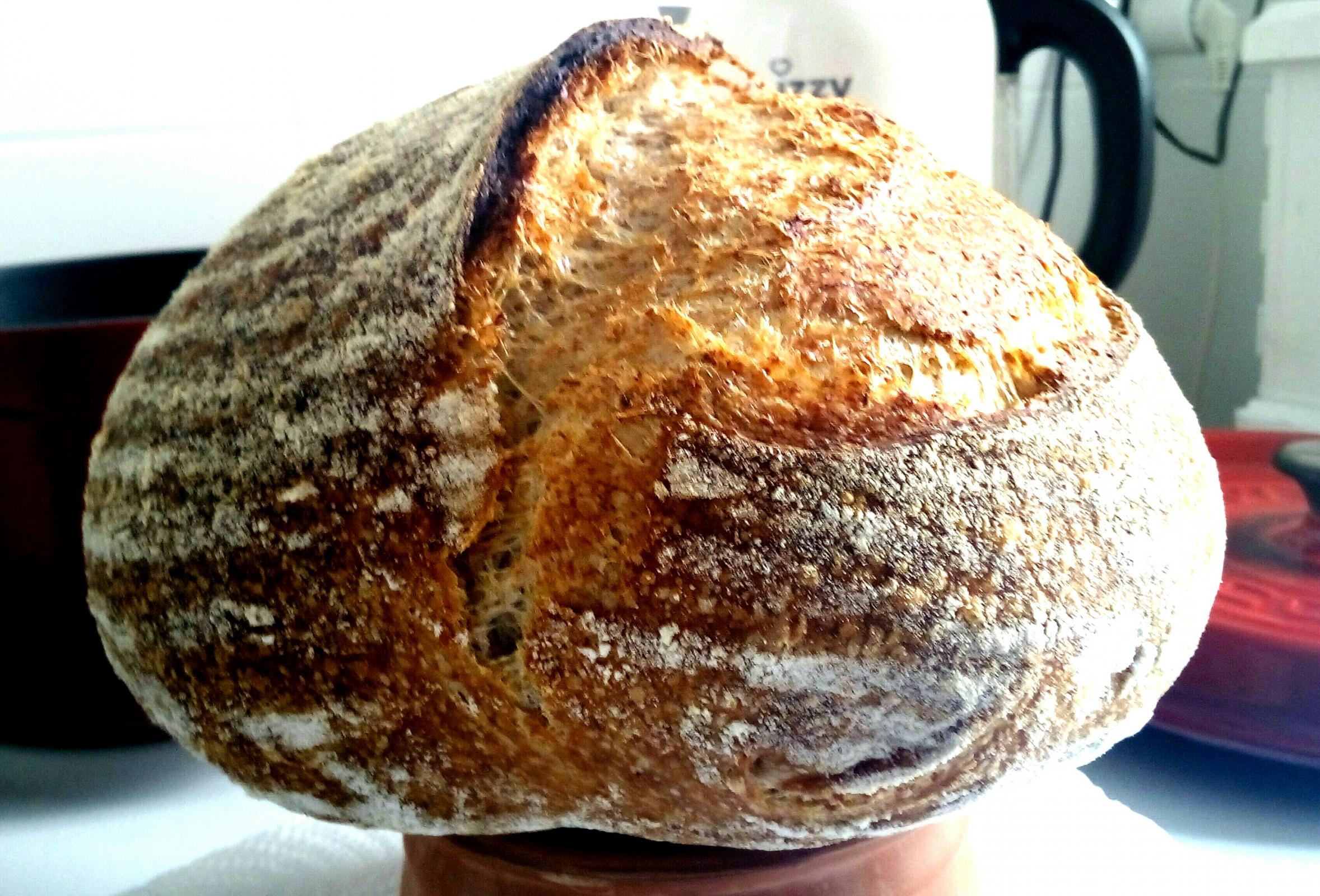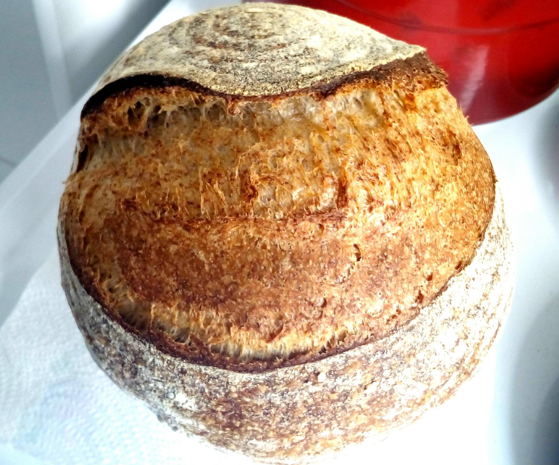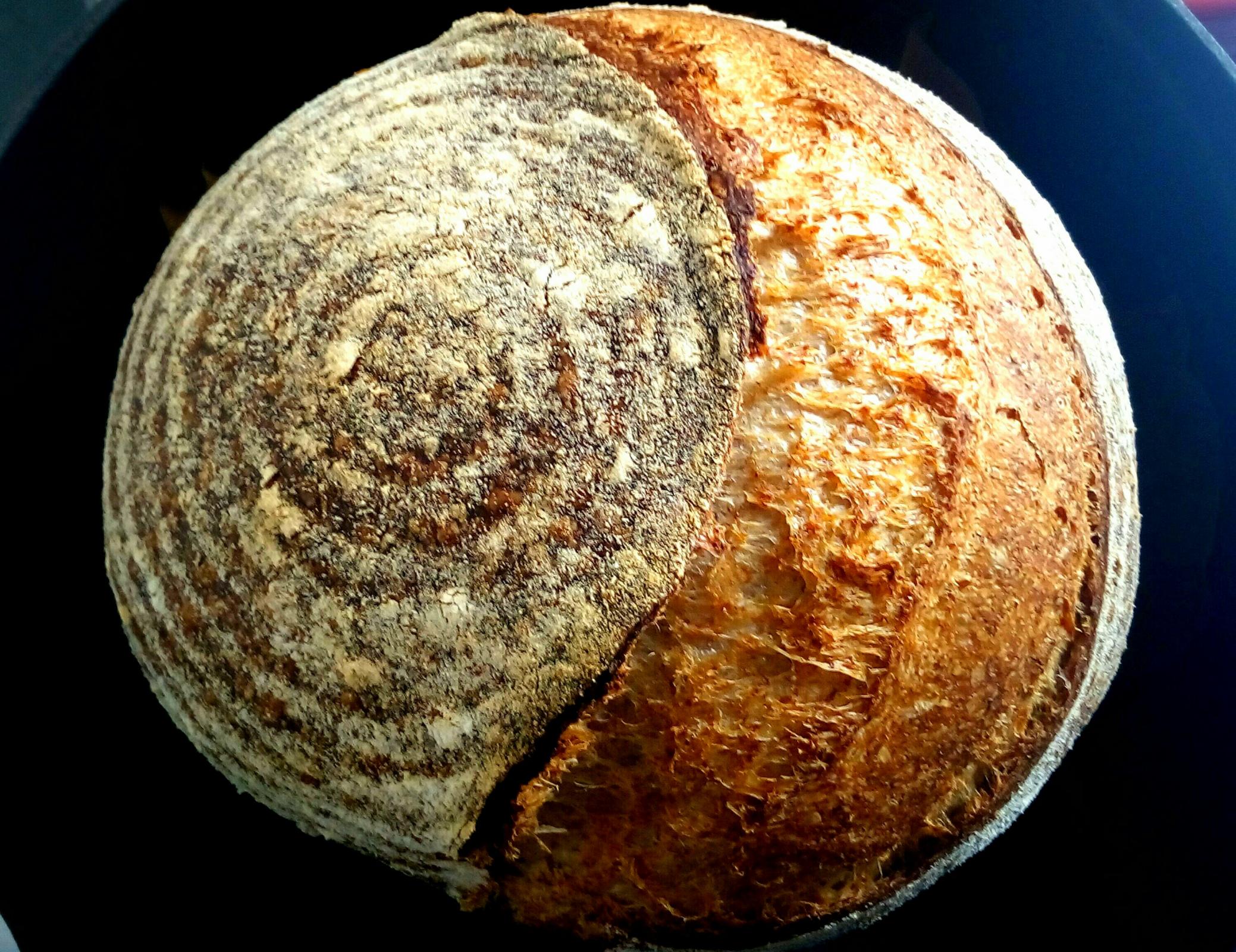 This boule was made from 100% whole wheat flour using dual sourdough/lactic starter.