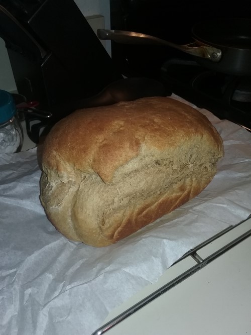 Tonight I made Floyd's Honey Whole Wheat Loaf, I changed it a little bit to match my kid's preferences. I halved the ingredients to make one loaf. So instead of 8oz of whole wheat and 4oz of bread flour, I used 4 oz of whole wheat, 4 oz of bread flour, and 4oz of all purpose flour. I and my kids like the softness of an all purpose flour, the bread flour is too chewey. I used half-half creamer instead of the evaporated milk and added 1 tablespoon of olive oil. for the Honey, I used half honey and half maple syrup (I had a some left in a jug) Other than that I pretty much made the recipe like it was. It came out much nicer than the Vermont loaf. It was easier to work with and no tearing!