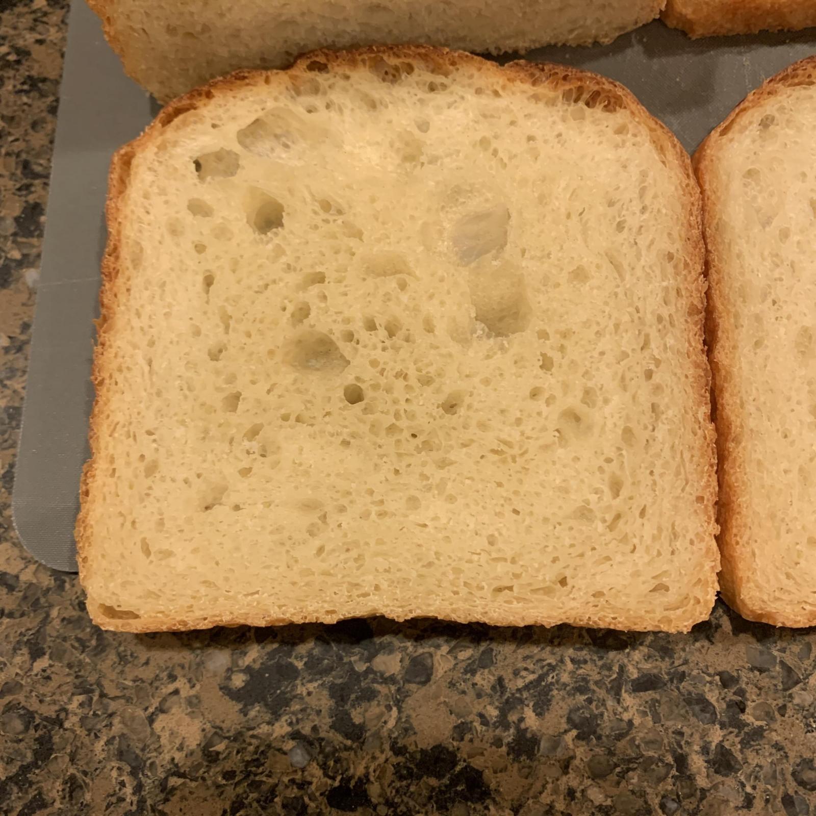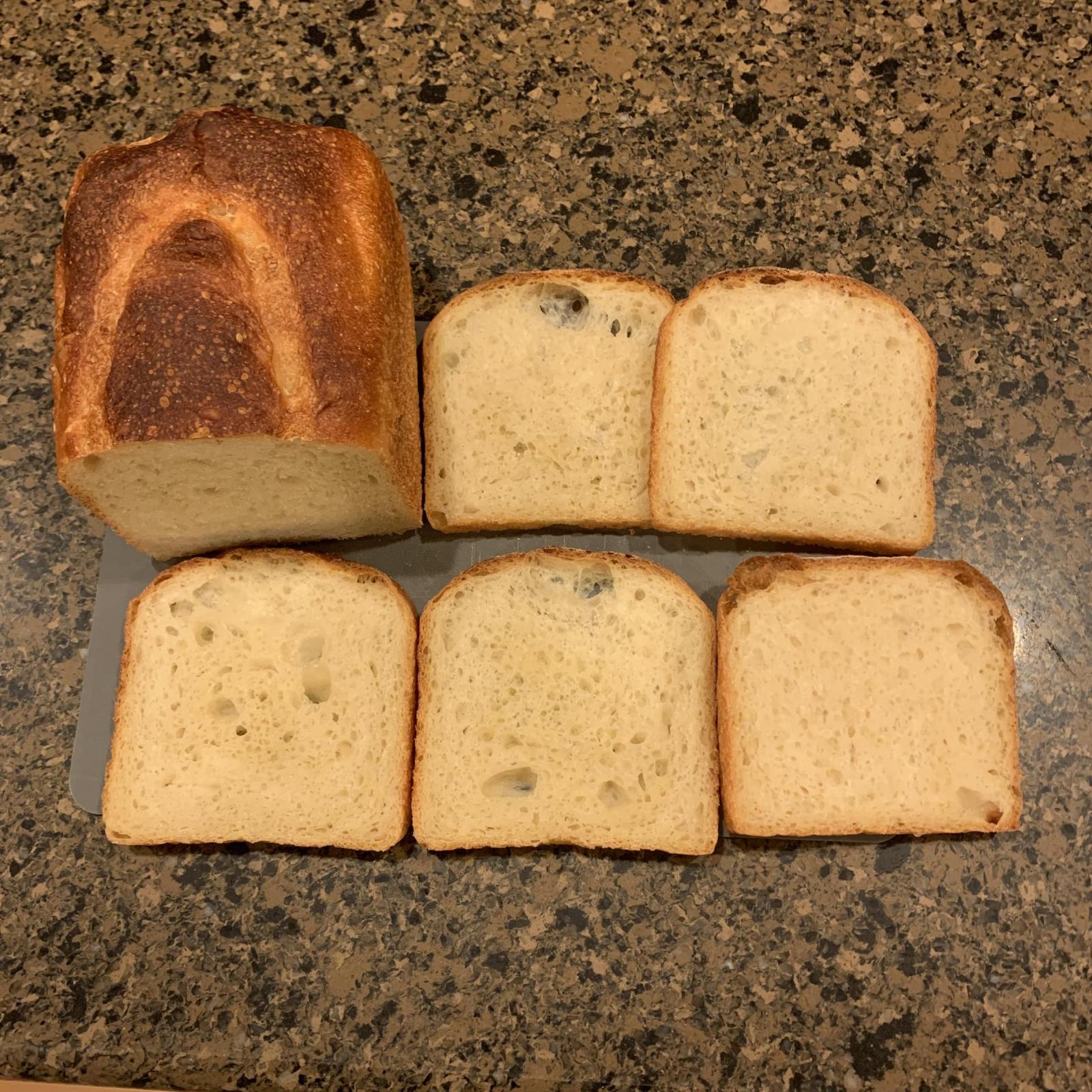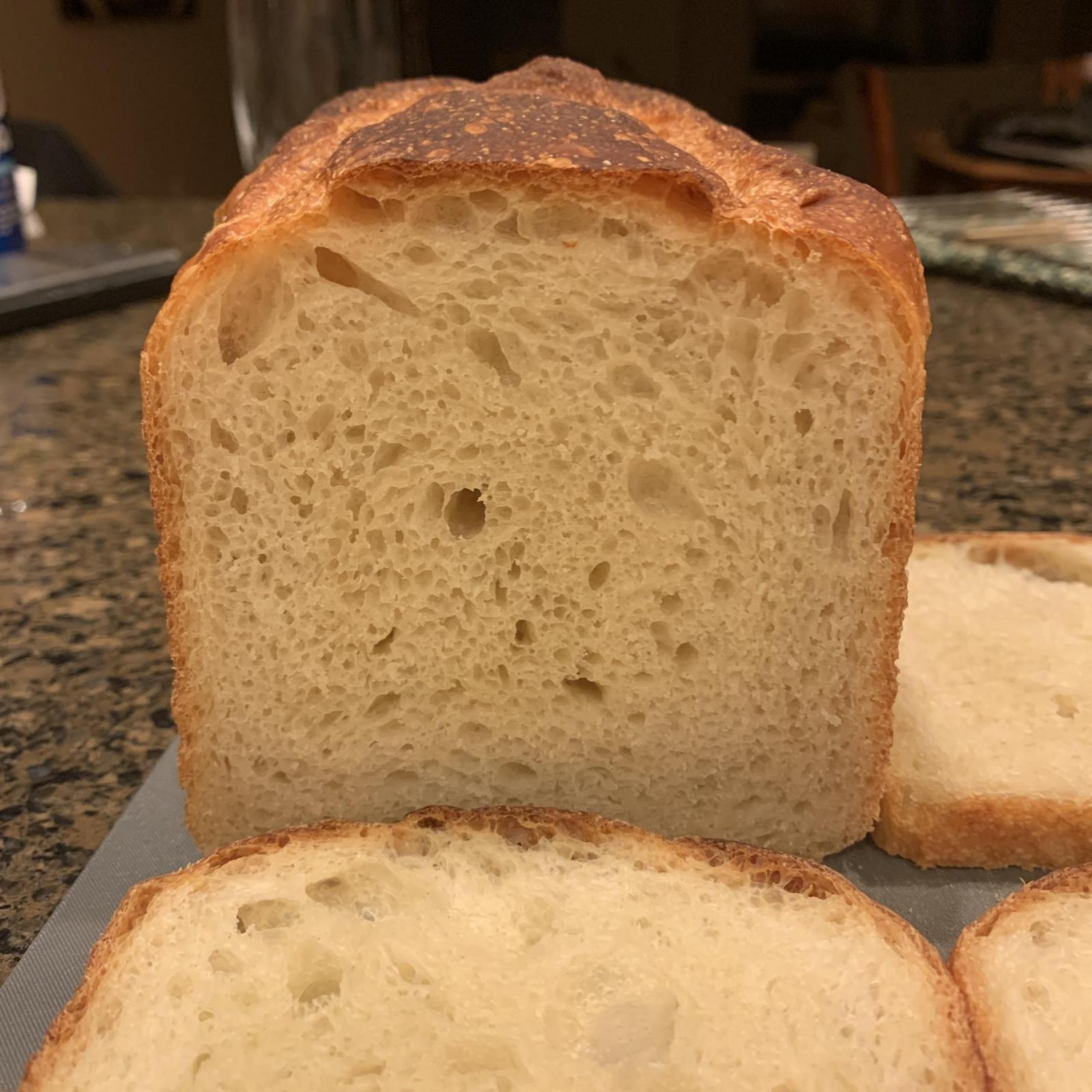 Three facets of this bake were new to me... a long, refrigerated fermentation for the poolish, no folding or gluten development (only punching down the dough), and a really strong bake for a dark, flavorful crust (and I didn't go as long or as hot as called for). The result... Not my prettiest work. My shaping for pan loaves is out of practice and was a lumpy mess to begin with. And... Learned that I either need a new razor or need to lubricate it with a little oil before trying to score a warm, fragile dough. It stuck and pulled more than it sliced and my diamond pattern turned into... well.... something not diamond shaped. :-)
