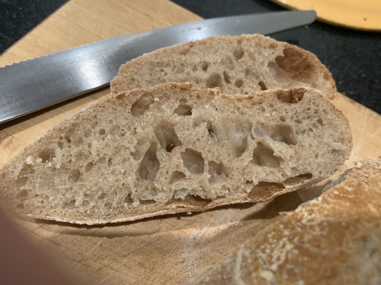 This bread is delicious! Crust is very chewy and the crumb is very soft and chewy . Quite like a good ciabatta. Really happy with it. Amazing open crumb for 40% WW.