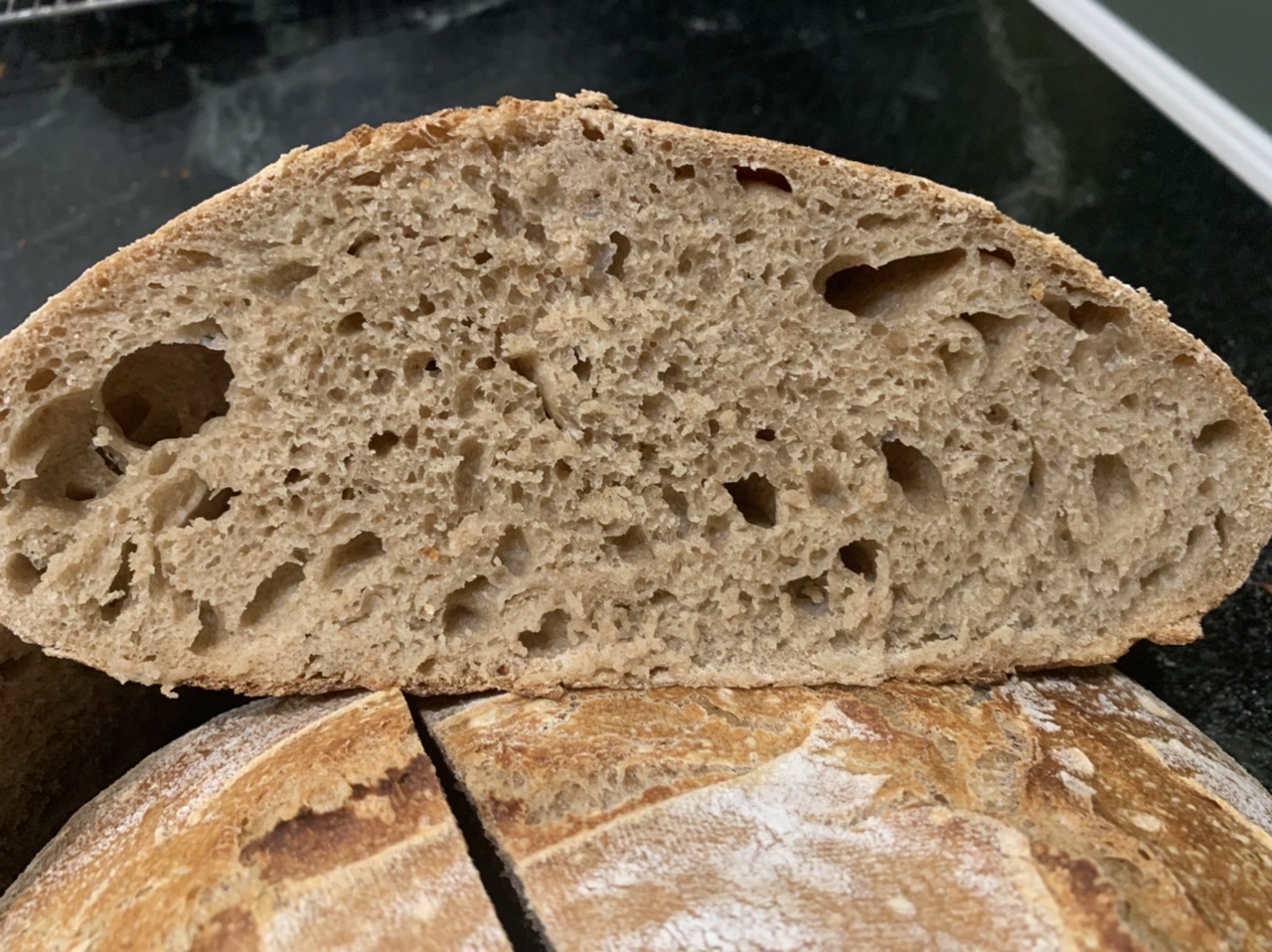 I saw the adaptation on the link to KA where he upped the levain to 100g and changed the grains and lowered the water etc. No crumb shot but the outside looks like mine. I’ve got lots of plans to try with this formula now that I have tried it once.