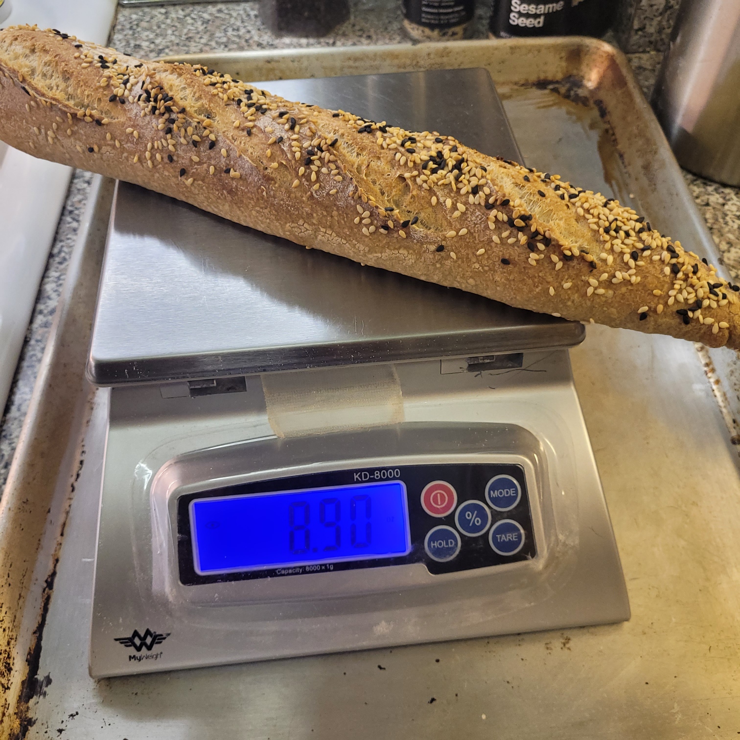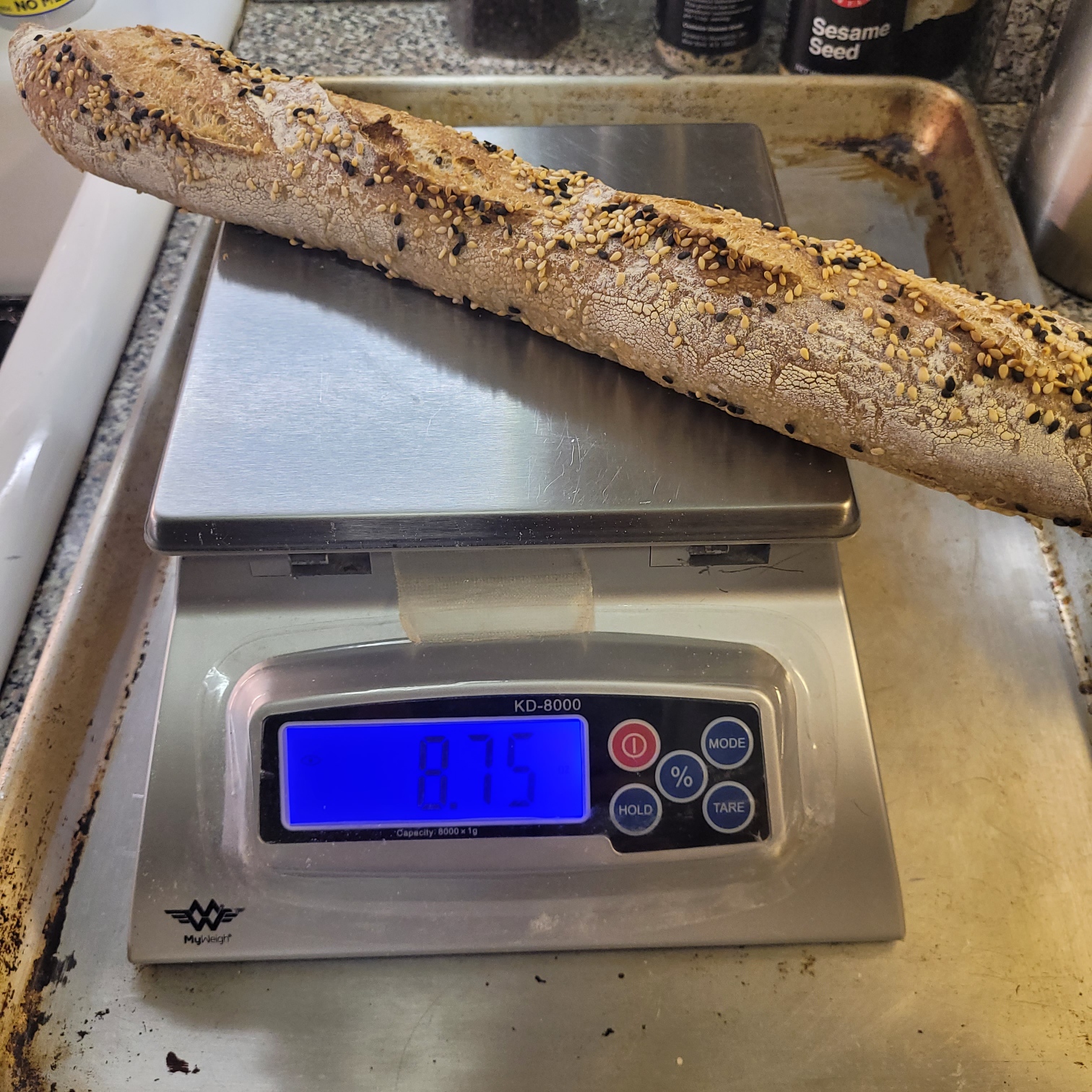 These will be my 8-ounce size sourdough baguettes. This is the weight range between the four, with not much deviation. Two were exactly the same 8.9 oz.