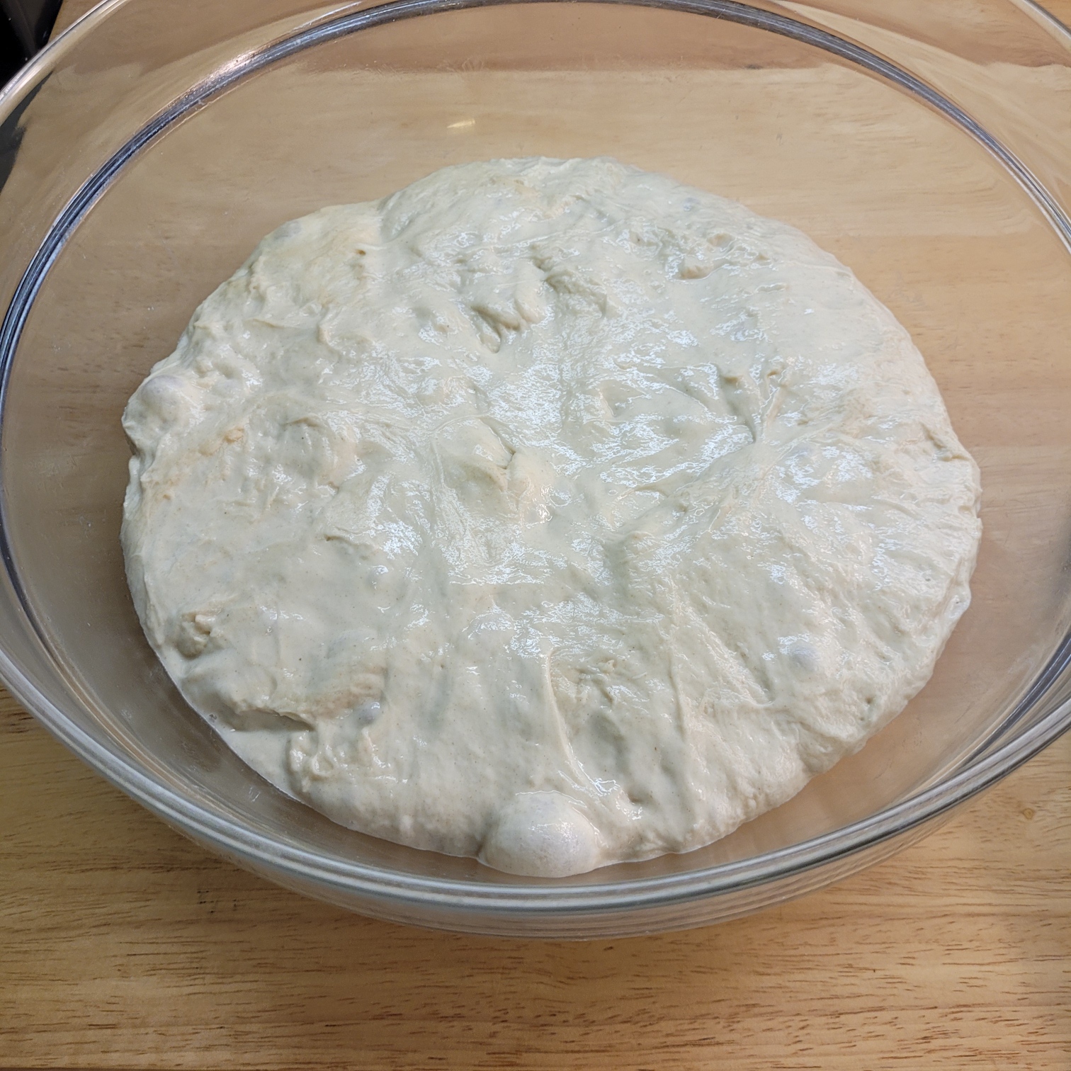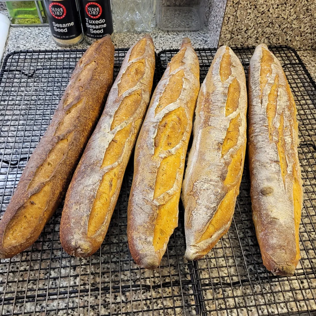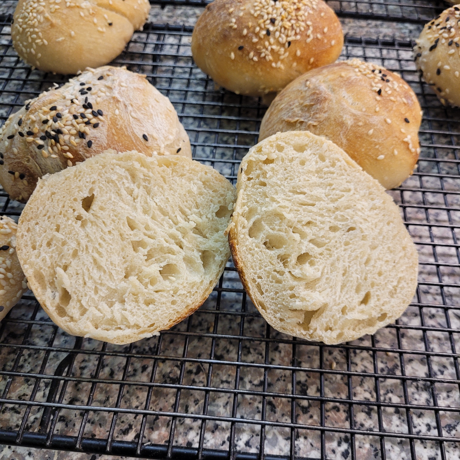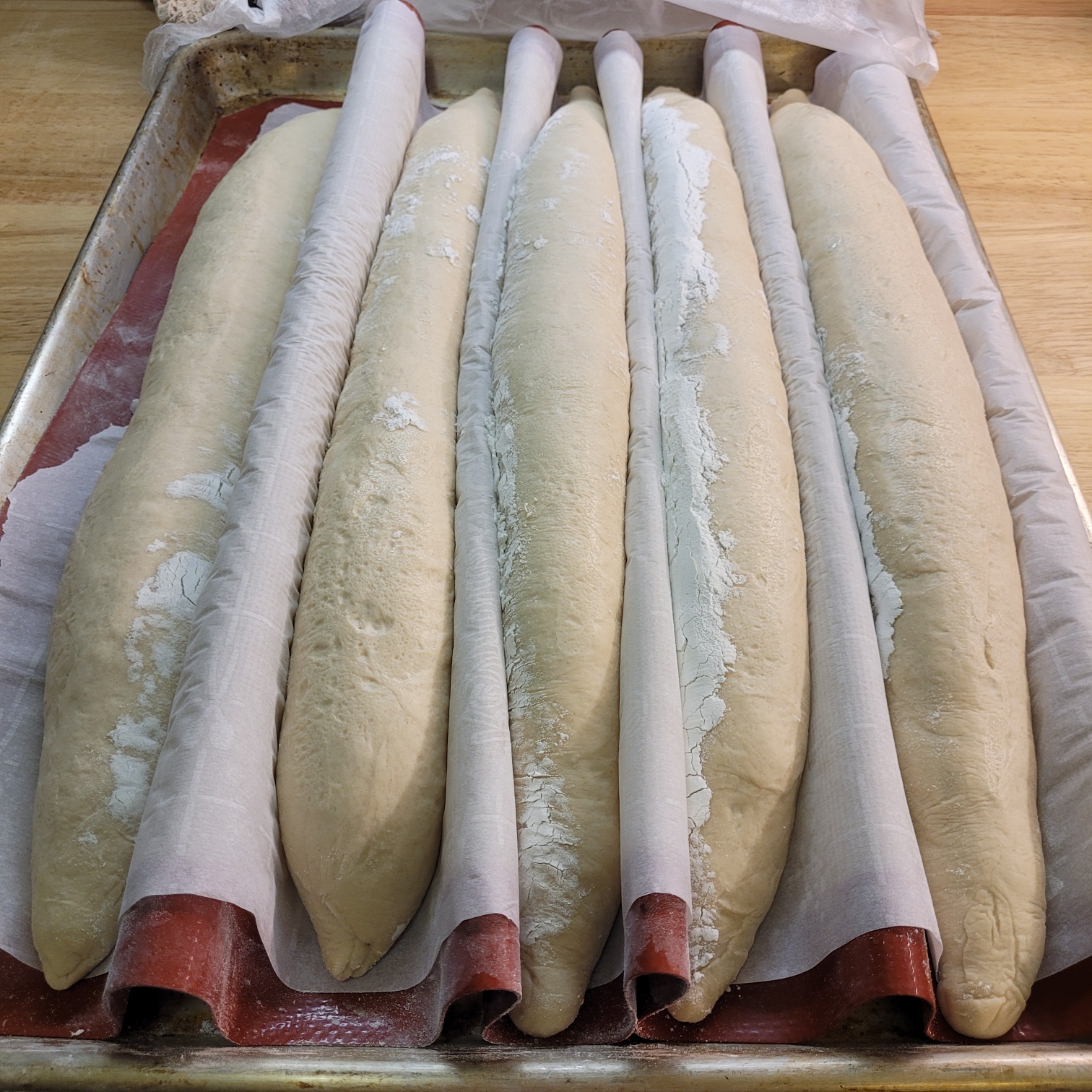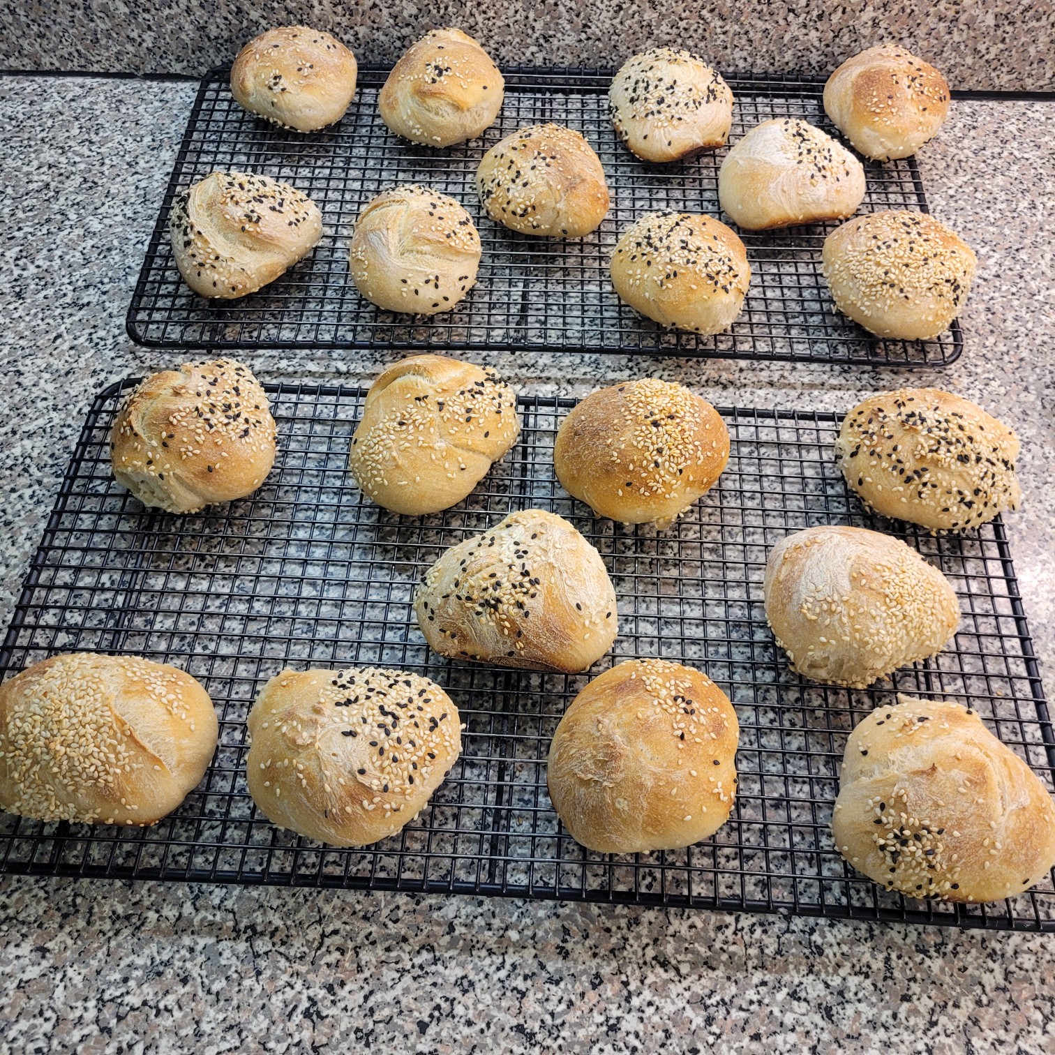 These are still over-proofed and will require one more bake to rectify. I took them to 2 shades darker and left more rice flour on the surface for a very nice rustic effect. The no-knead rolls are doing well. I will begin the shaping in approximately two hours. After one more bake in the next few days, I must get back to finishing up before the move.