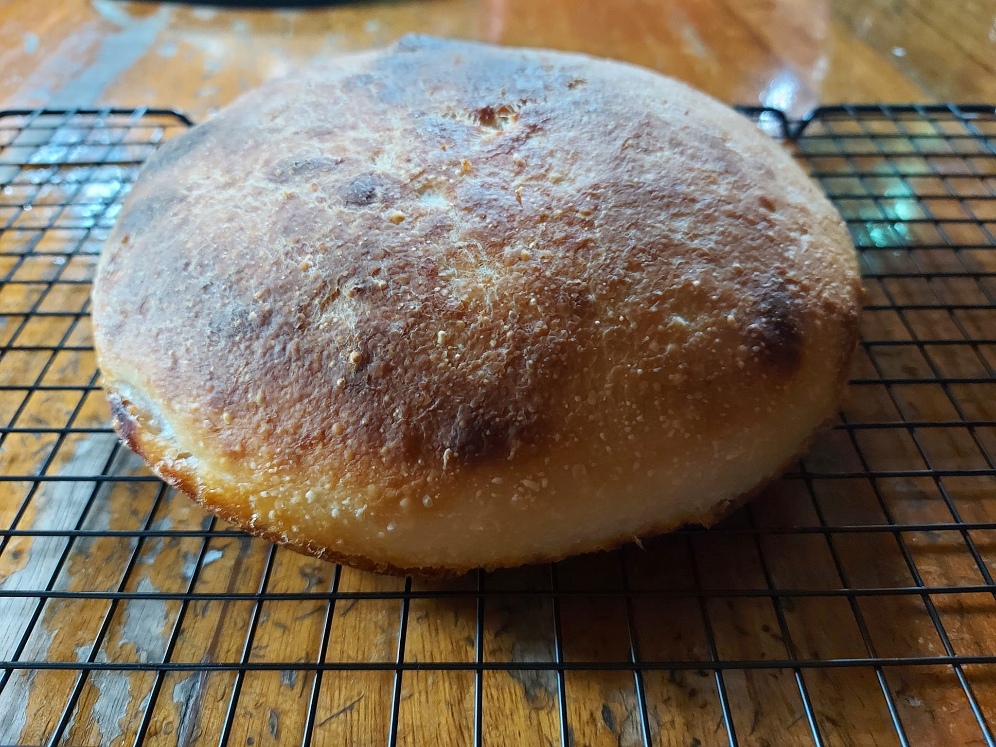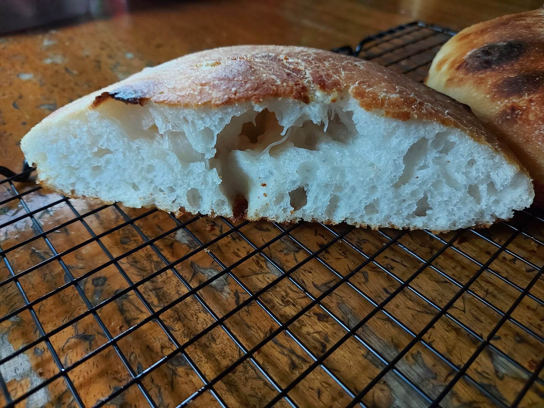 The dough is very simple: Flour, water, and salt, and sourdough. 70% hydration, 19% prefermented flour. Fermented for 4 hours and given 3 stretch and folds then refrigerated overnight. No preshape nor even shaping, just plopped onto a pan oiled with EVOO. Proofed for 3 hours then baked at 250C until done.