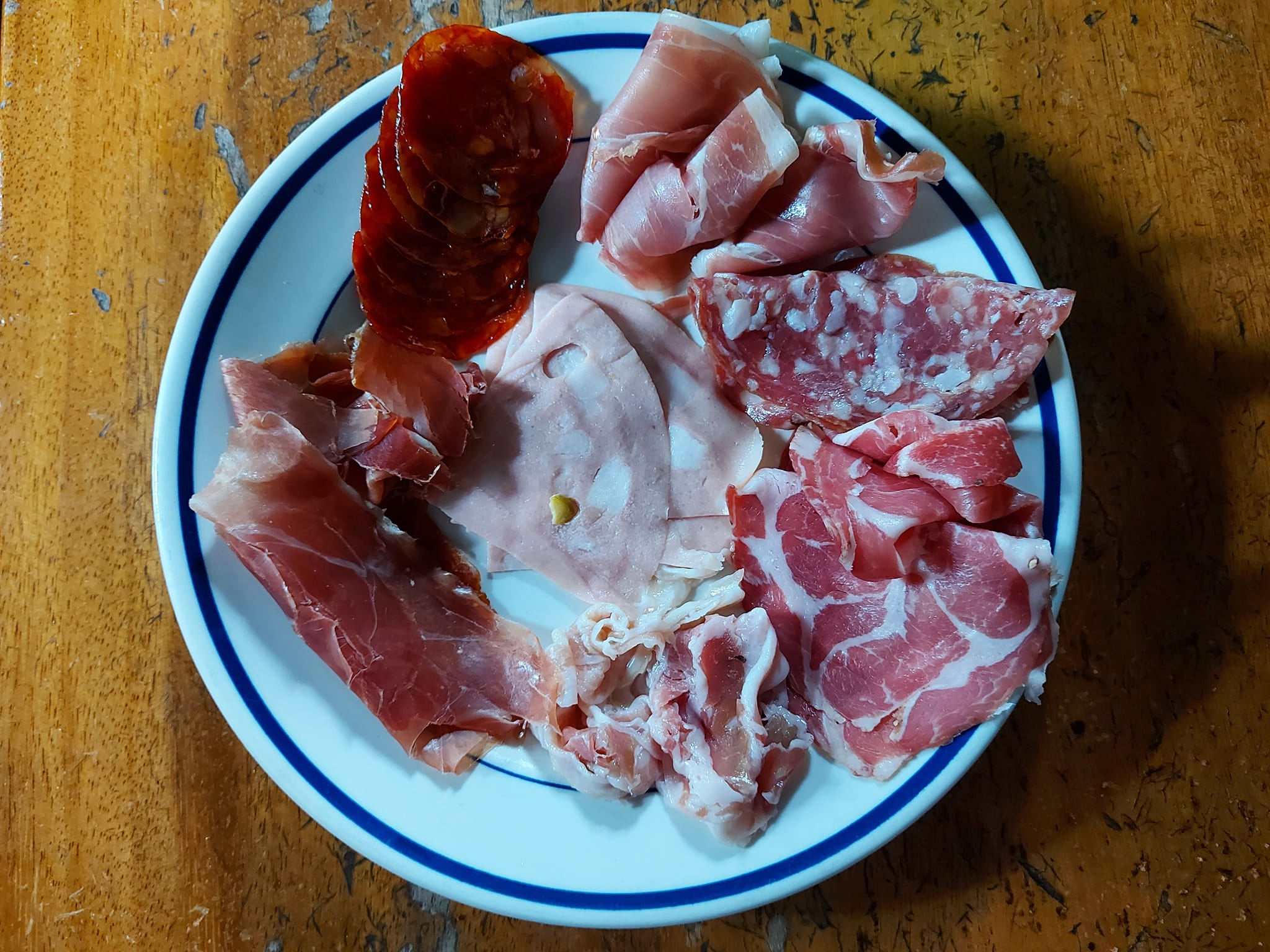 Clockwise from top right: Prosciutto crudo, Salami Napoli, Capicollo, Pancetta Arrotolata, Jamon Serrano, Chorizo Iberico, and Mortadella in the center.
