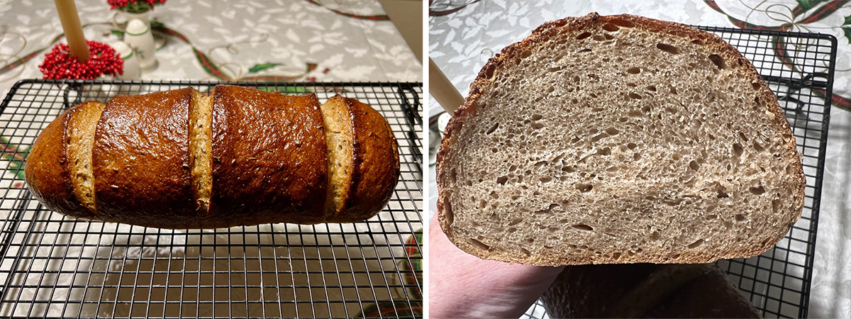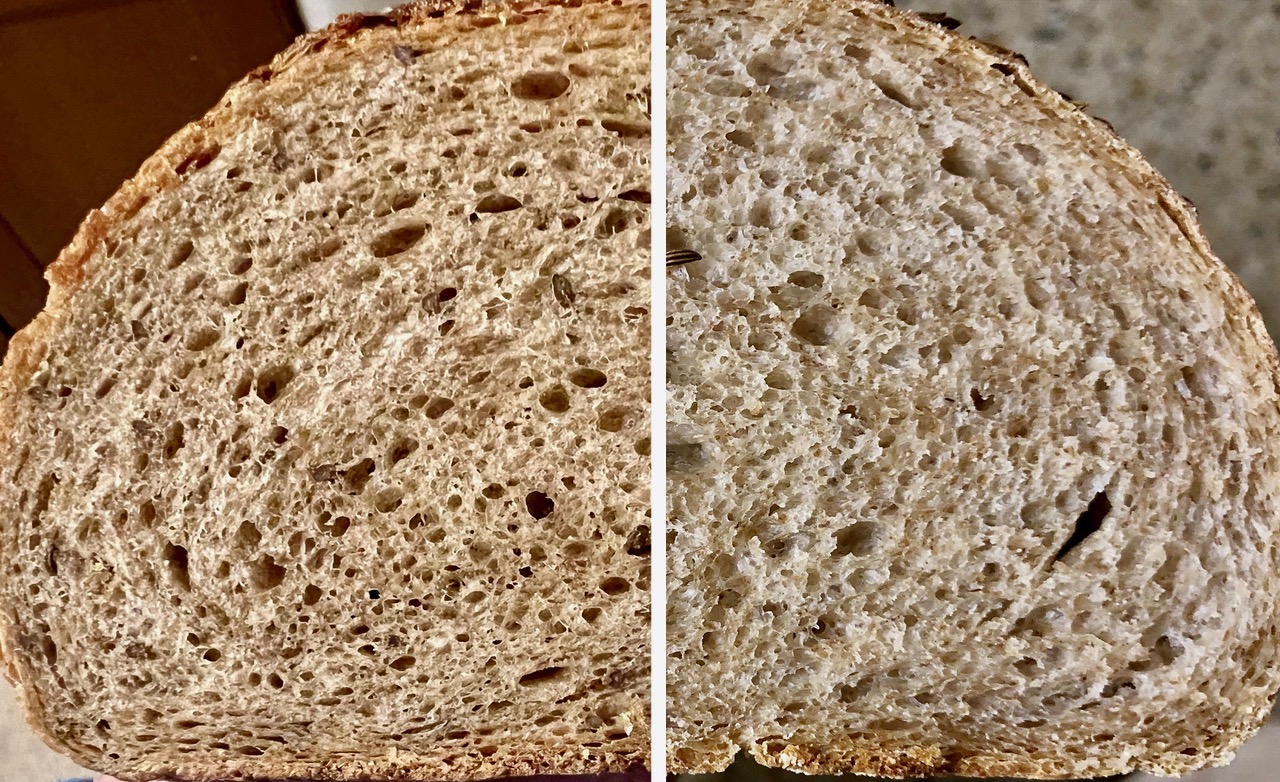 It took a couple weeks, but I finally made another forty percent caraway rye yesterday. I increased the hydration in the levain so it would have a little more breathing room but, despite this, there was very little rise at the end of 14 hours. It was puffy and smelled of alcohol. This did not bode well, but I was determined to proceed. I mixed the dough as advised by the rep at KAF with the dot on the Ank knob at about 2:00. It took about 15 minutes and still didn't feel "normal," but it was far less sticky than the last few bakes. It rose well in bulk and so-so in the final proof. Not much oven spring. The crumb was maybe a little heavier than usual, but not bad. Unfortunately, the bitter flavor was back with a vengeance. My husband said it gave him heartburn. Later, my daughter stopped in and asked why the crumb was so dark. That sent me off in search of old crumb shots to compare it to. (The bread on the left was yesterday's bake, the bread on the right was from a year ago). I just don't know what to make of all this. At least the dough isn't breaking anymore...