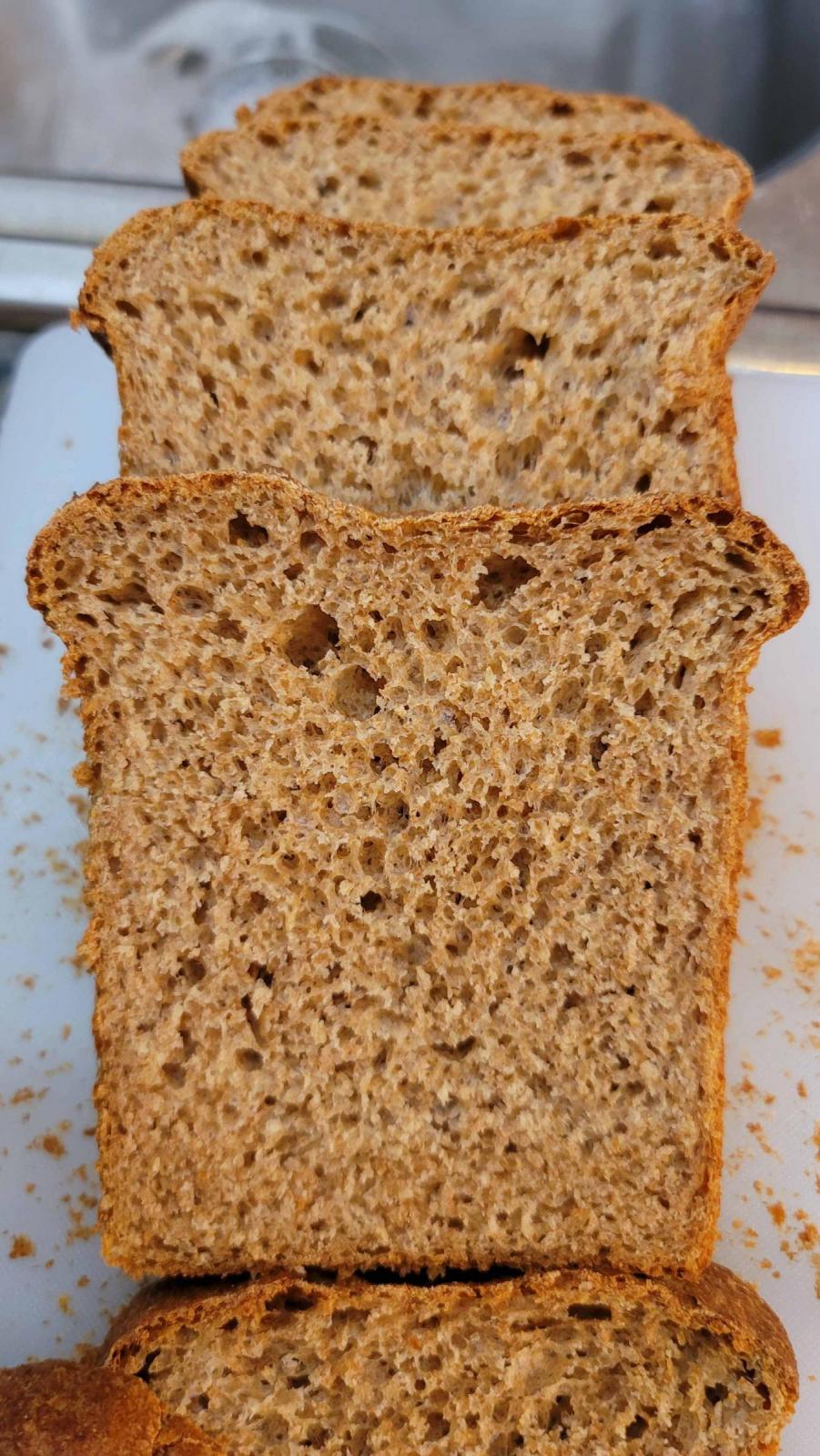 Yes, it is a pan loaf. I have never tried it as a free-standing loaf so I don't know for sure, but I bet it wouldn't be a pancake loaf if I did. The WW flour from KA seems to be very thirsty and have a lot of structure in developing the dough so a 100% hydration does sound very high, but it does not feel any worse than a 75-80% hydration white flour loaf to me. Obviously, the 40% dark rye adds a lot of stickiness to the dough, but I am used to handling it.