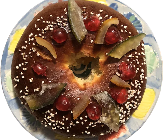 This is a brioche dough flavored with orange flower blossom water and studded with candied citrus peels then decorated with colorful candied fruits.