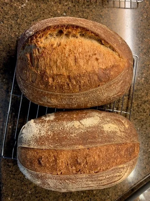 They were are baked at ~460 F on a stone with initial steam from a pan of lava rocks. As shown in the photos, one seam sealed on baking but the other broke open, allowing a beautiful bloom. Is this due to random variables that are beyond my control? Or is there something I can change in my technique to get both loaves to bloom consistently? At this point, I'm considering adding a bit more commercial yeast, but also wonder if this has something to do with my shaping technique. I welcome your advice.