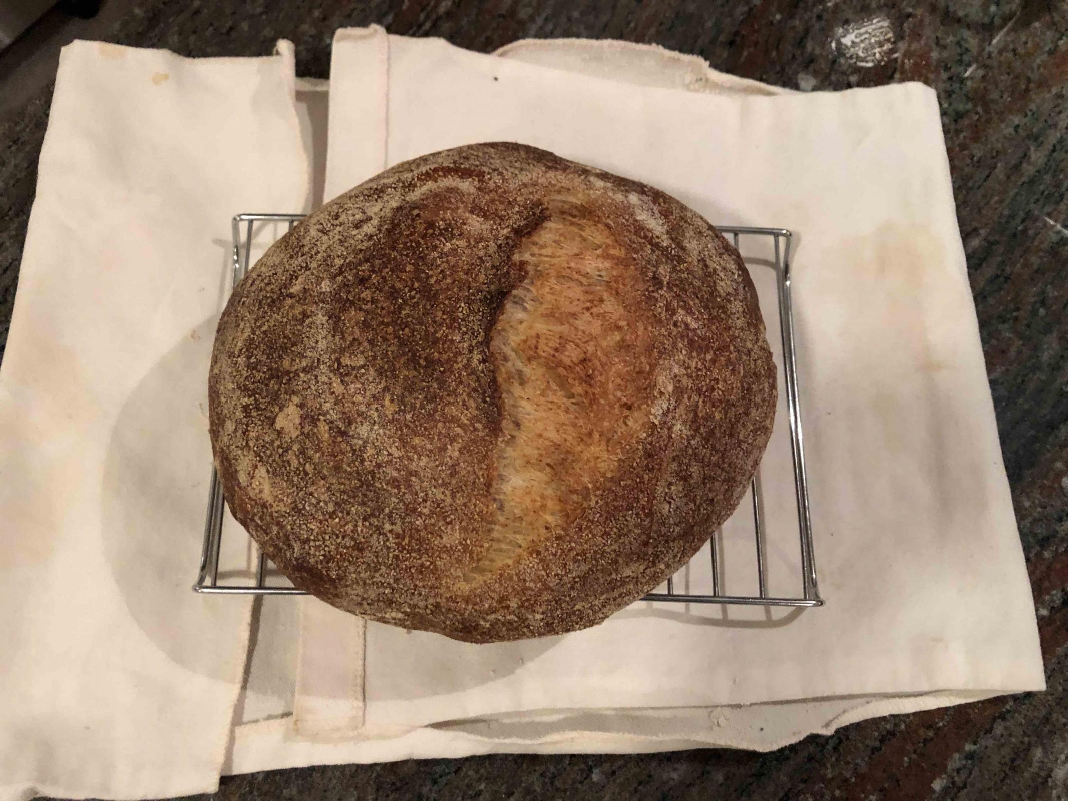 this was my second or third time doing the tartine country bread (from the NYTimes' published recipe), but probably the first time that i was really careful about doing the proof in a 80+F environment. i let the bulk proof go 3.5 hours and it felt right on the edge of over-proofed, so i only did 2h of final proof and then it spent a few hours in the fridge before bakin g.