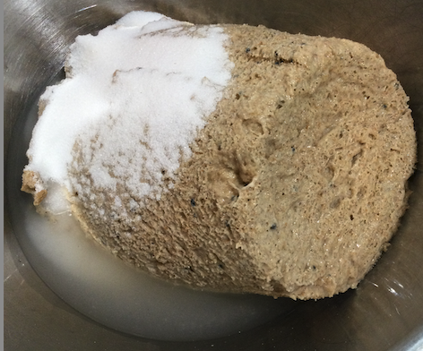 - 304 gr water (total flour = 500 gr; 80% hydr: 400 gr water) Set aside 20 gr water to add with salt and yeast. Add water only until dough begins to break.