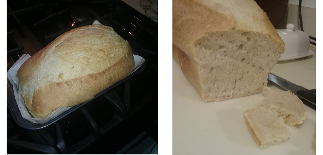Day 2: At 10am I did several stretch and folds on a floured surface. Rested once. Then at about 12pm, shaped and left out to rise in a dark loaf pan. At around 5pm it wasn't quite doubled, so I scored it in the middle put in a cold oven and preheated it to 350F. Once the preheat was done, I put my timer on for about 30-35 minutes. Internal temperature as 209F when I took it out.