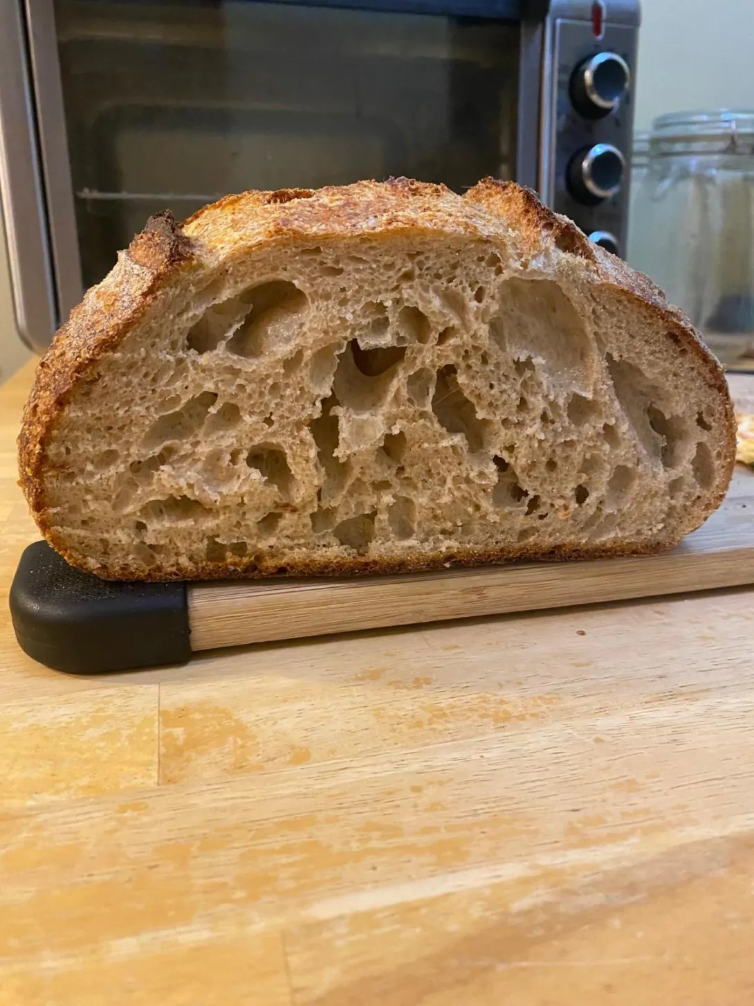I'm relatively new to sourdough baking, and this is my second loaf. I'm using a 50/50 rye starter fed daily, and a 70% hydration dough for this particular bake. I suspect that the spread of very large holes is because the dough was underfermented, but if anyone else has ideas on how the final product could be improved I would greatly appreciate the feedback!