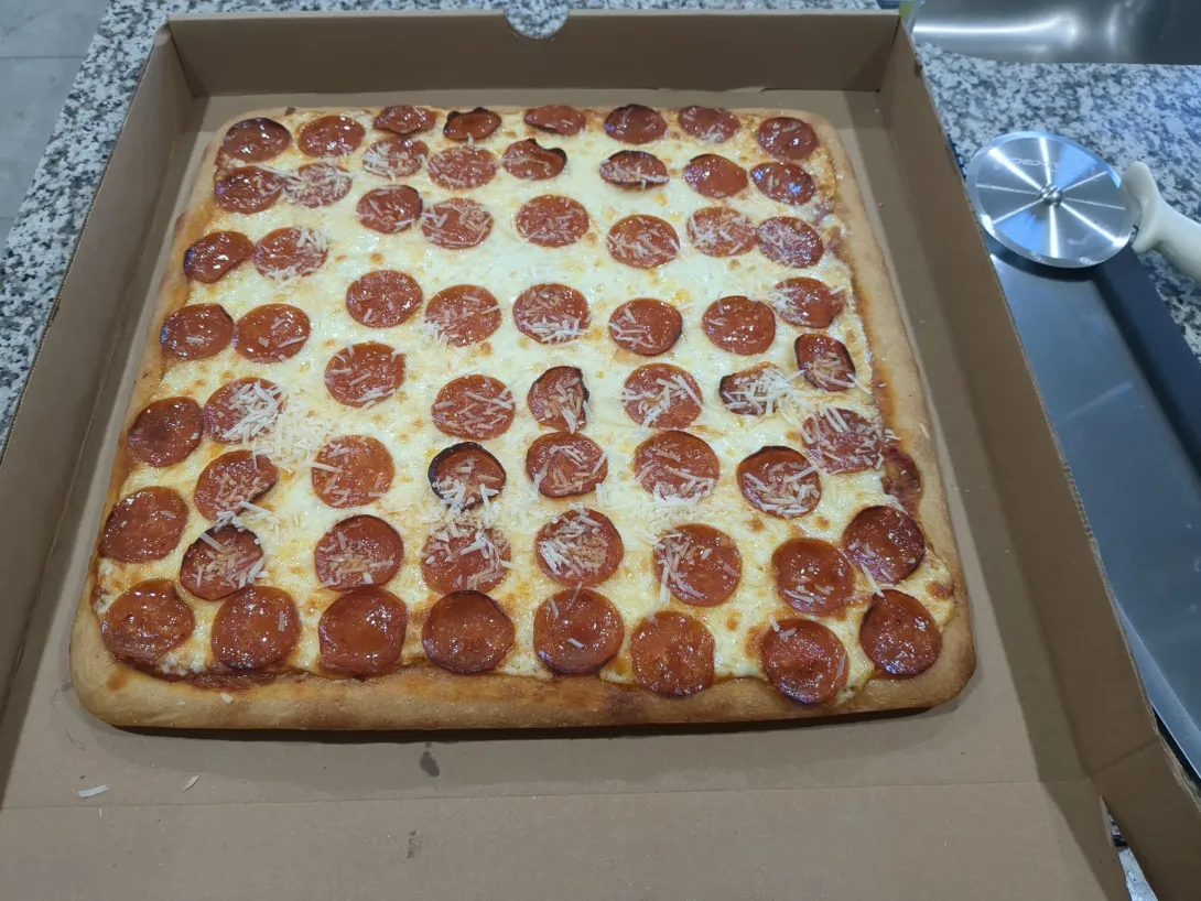 This is a Brooklyn-style, par-baked, thick-base Sicilano pie. Extra cheese is standard ((two full pounds) of my own east coast blend. Only one optional topping is offered pepperoni. I'll tell you this people the iconic spicy spring has nothing on this masterwork!