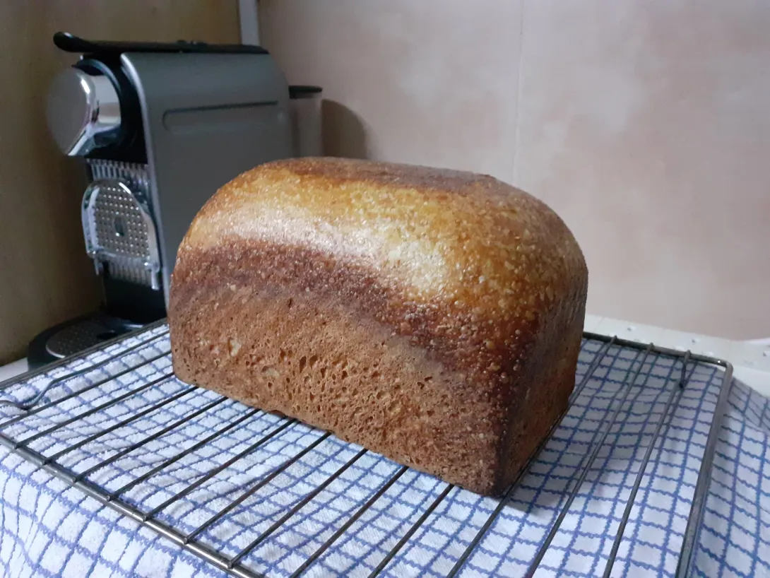 Lovely well rounded taste. A soft crumb with a pleasant tang. Enough to say sourdough but not overwhelming the flavours of the spelt and golden wheat.