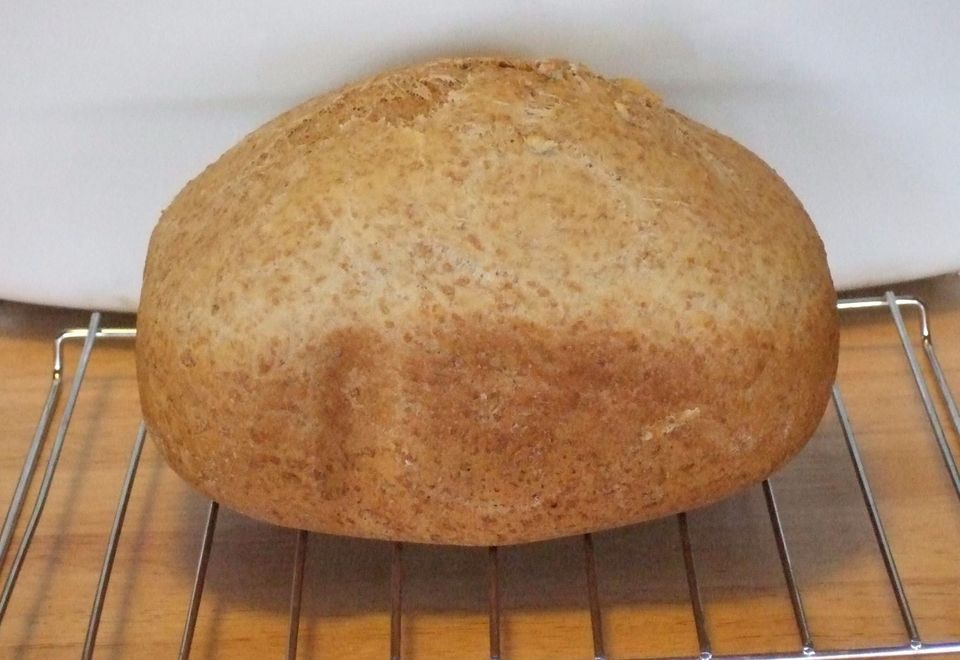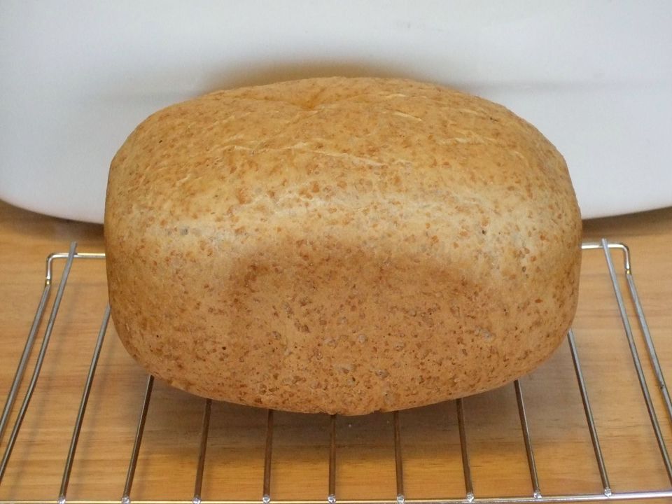So how cool is it? I made a loaf using the whole wheat program and measured the bread pan temperature using an infrared thermometer. The highest it got was 282ºF. That is the lowest pan temp I've measured for any BM. And it didn't get there until near the end of its bake cycle. And, because of the low baking temps, the bake cycle is quite long: 80 minutes for a medium-crust 2 lb. loaf.
