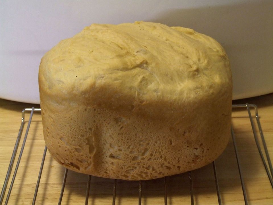 The guinuea pig for this experiment is another West Bend machine, model 41053 from the late 90's. I picked one up at a local thrift store in like-new condition for next to nothing. It has a horizontal pan made from thin sheet aluminum, bakes a bit hotter than the 41099 (305-308ºF), makes decent bread, and doesn't brown the upper crust well, as can be seen in this pic.