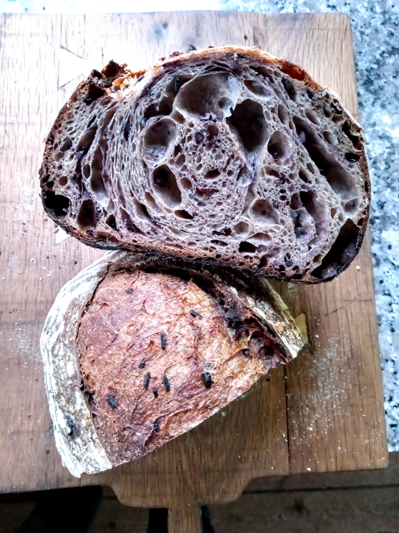 I baked at ~550, and it really seemed to help get a nice spring, though there were also some big holes in the center that are slightly more than I'd prefer. The flavor is nice. The rice as expected add a creaminess to the crumb, but the purple rice gives a more dark/complex taste than brown rice.