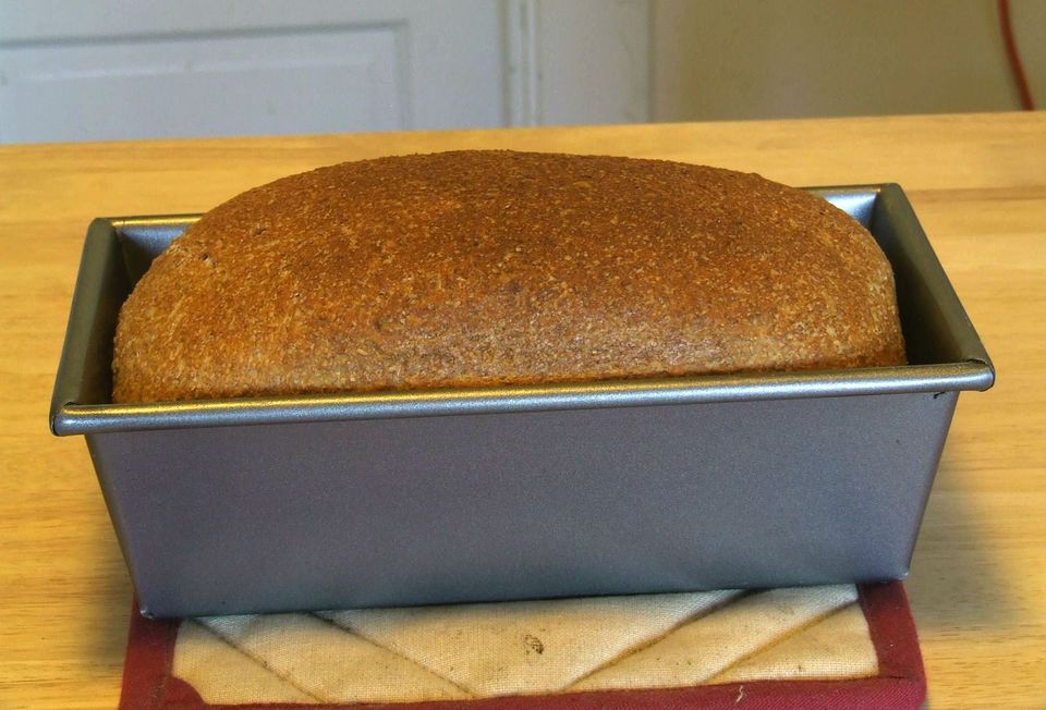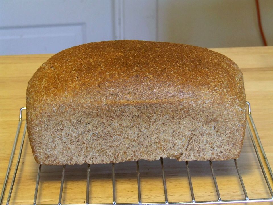 Maiden voyage of making bread outside of a bread machiine. Yesterday I baked a loaf out on the porch, mixed/kneaded using my just-repaired KitchenAid mixer and baked in the Euro-Pro oven, using an evolving recipe I've made numerous times in my Panasonic bread machines as a great "daily bread". It basically has equal amounts (by volume) of AP flour, WW flour, and wheat bran. 45 minute autolyse for the flours.