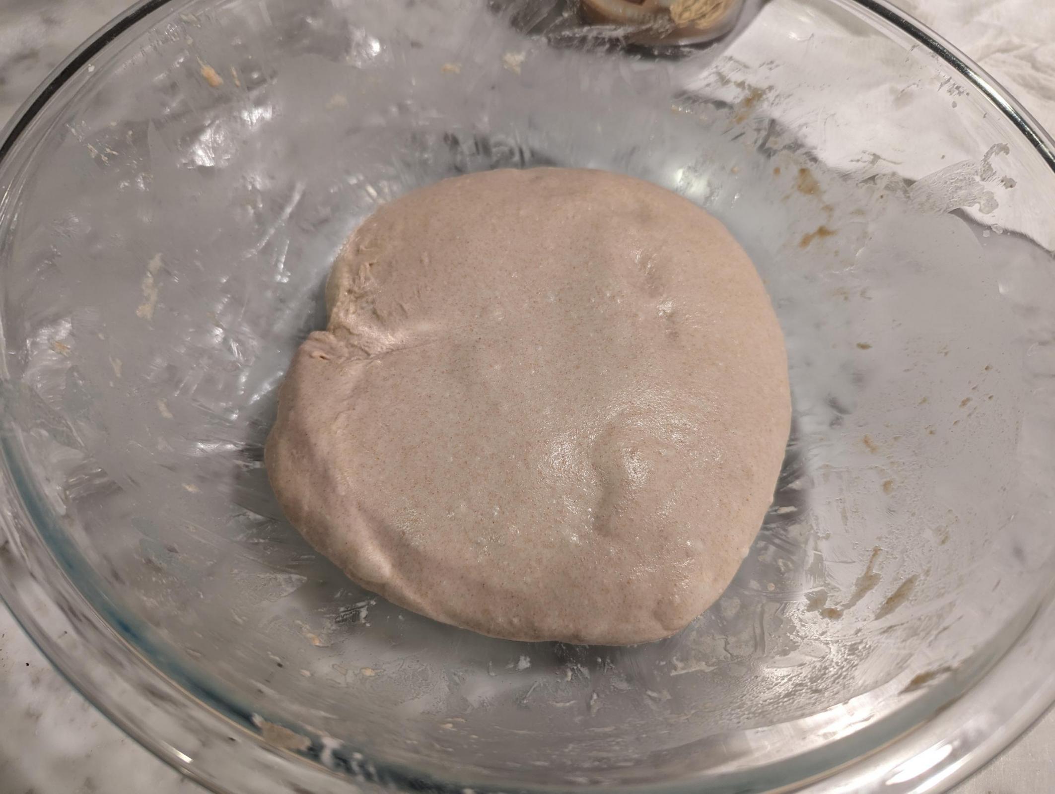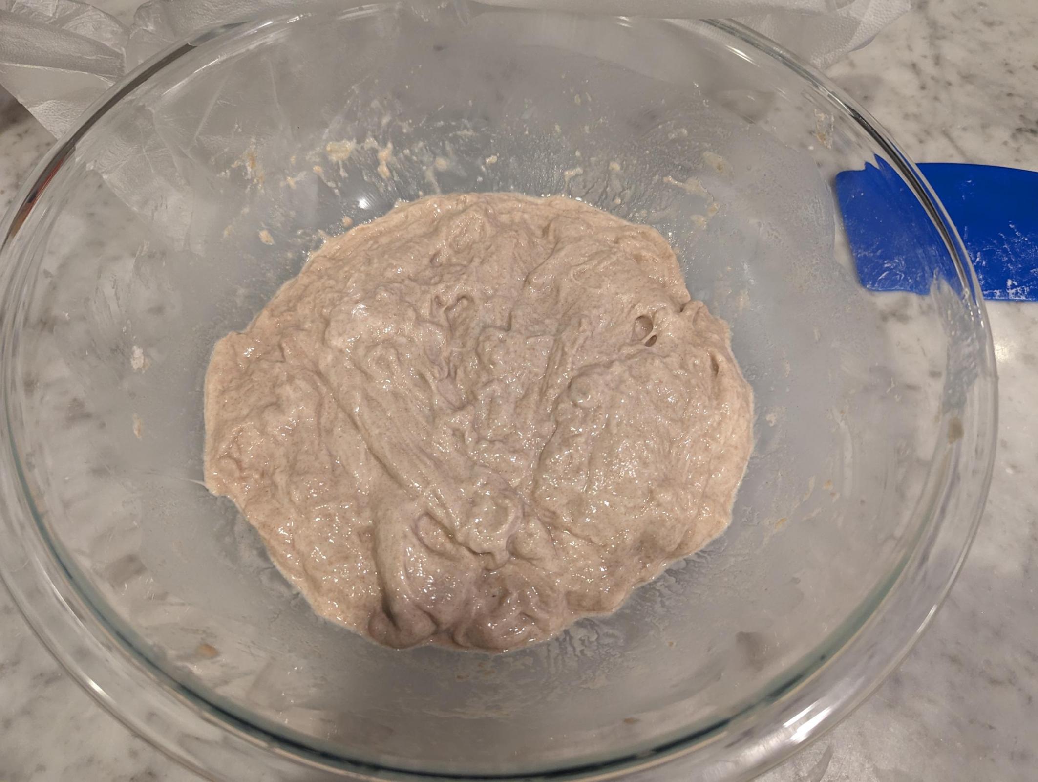 Lindley Mills says to add 10% - 20% more water on any recipe you're using 1:1 for this. I was a little hesitant as I don't do well with high hydration dough. I started with 66% hydration and an autolyze for 30 minutes. At the end of the 30 minutes I dissolved the salt and yeast into 20g of water and mixed it in, bringing it to 70%. It felt firm, not quite the hydration I wanted. I added an additional 20g, then another 40g. After I added the last bit, I thought I went to far as the dough looked like mush.