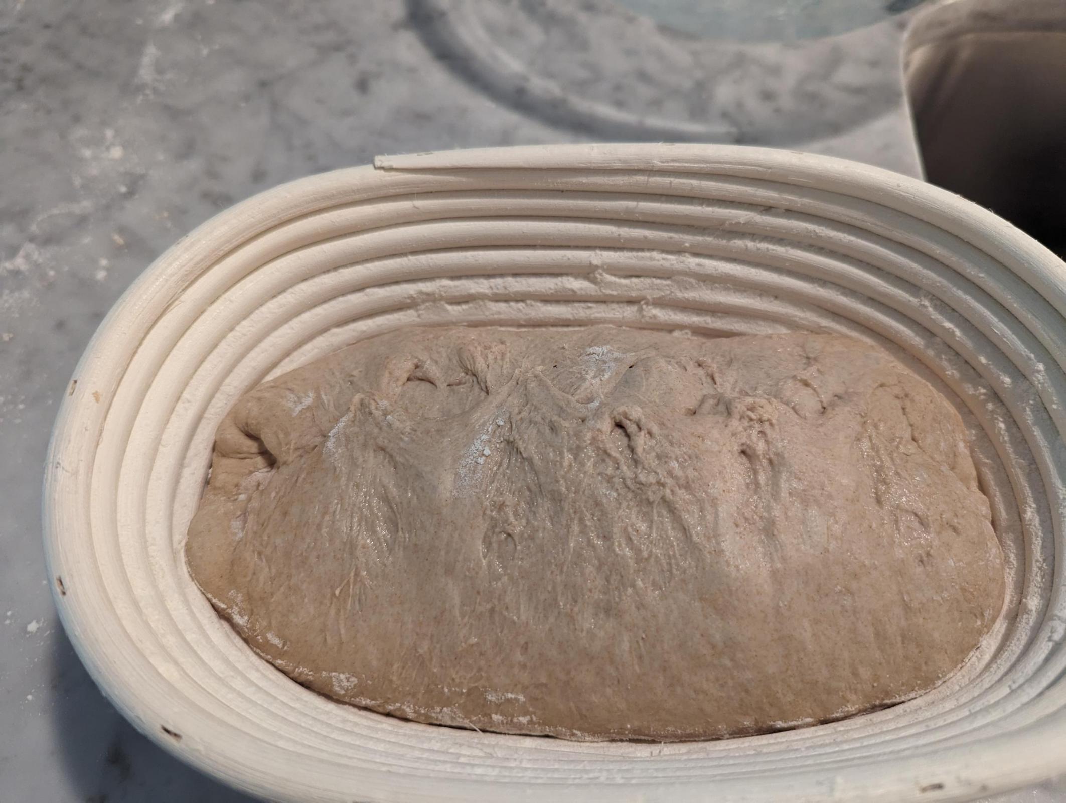 Pulled it out after 16.5hrs. It wasn't overly bubbly, making me think maybe I didn't develop it enough or let it ferment long enough, but my schedule dictated it was time to bake (I have 2 young children and I bake on their terms, not mine :)) Gave it a 30 minute bench rest, preshape, another 30 minute rest, then final shaping into the banneton. Side note, I'm so grateful to have a banneton that fits my loaves- being able to seam them up after they go in is helping my shaping a lot I think.