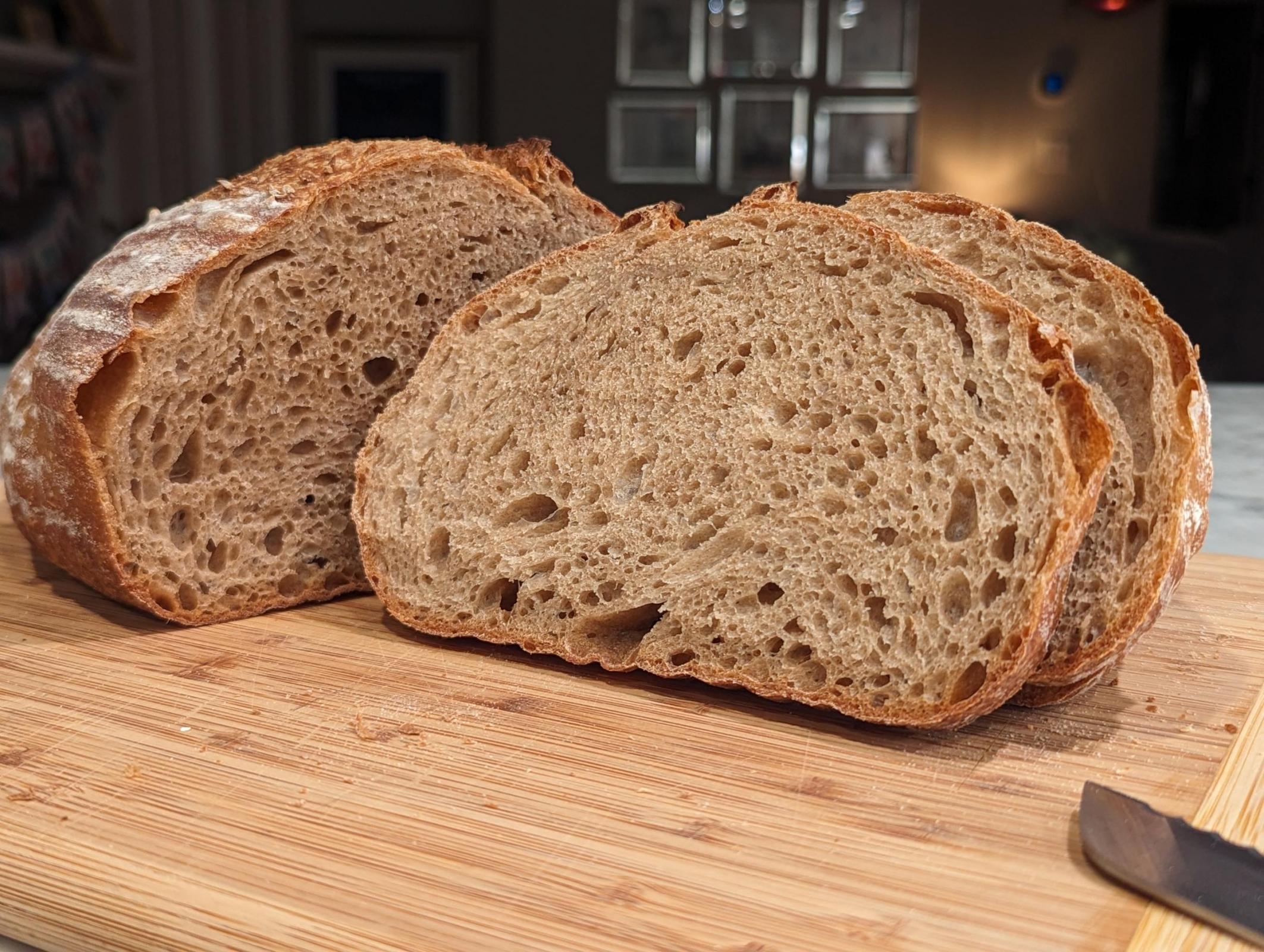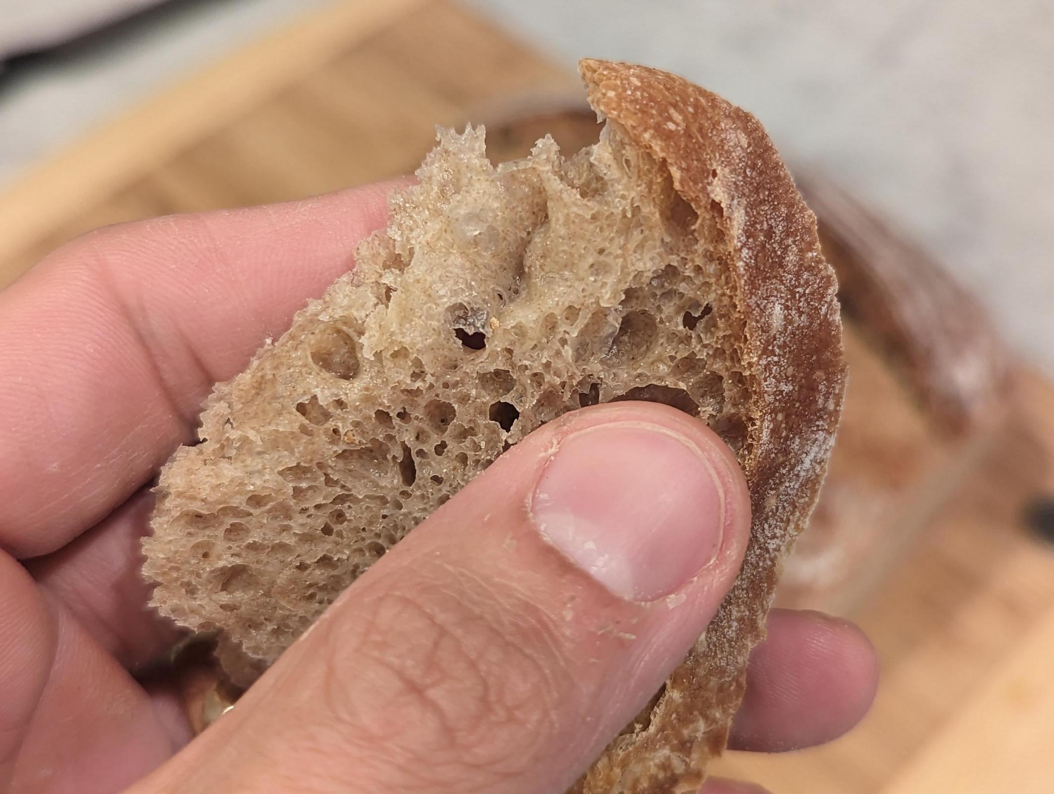 Crumb doesn't look too shabby! I toasted up a slice and was suprised- the taste is very wheaty, almost as if it was 100% whole grain. I imagine if I did a 100% SS loaf I'd need something to take the edge off- some orange juice or brown sugar or something. It's not unpleasant, but it's forward for sure. I grazed on some chocolate while finishing slicing and decided to try one more tiny slice toasted. It tasted much less strong, so thinking that this may be better done up as a sandwich loaf or muffins or something vs a hearth loaf. Or maybe a hearth loaf but with some additives for sure. Also, it is defo some leathery crust- I think I may need to let my loaves sit in the over for a bit longer to dry out? Or maybe after the 20 minute mark I should try pulling them out of the baker all together and switching to convection.