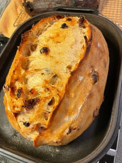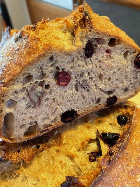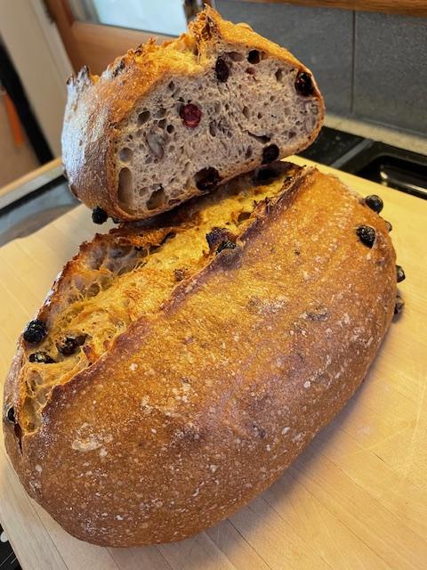 Tom, thank you for your excellent suggestions last summer. Using the foil and parchment paper and the foil shields suggested in other comments, I'm now making nice looking loaves with good coloring on all sides. Here are a couple loaves of cranberry-pecan I like with breakfast. About 30% Cairnsprings WW, 30% KA and Cairnsprings bread flour, and 30% KA AP, the remainder dark rye.