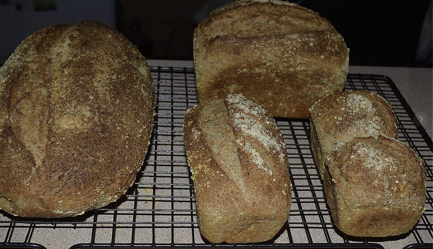 This morning i have done a fast bake with a 1 hour bulk fermentation time This dough is made from Fresh Milled Red Wheat, Millers 1100 Bakers Flour and Lupin Flakes from the Lupin Coi also used some of the sour dough starter that is kept in the fridge left overs after revival feeds to bring the starter amount back to a manageable size. I calculate that as half flour half water and adjust my formula to accommodate that. The advantage is of course much less waste as well as flavours that have been generated in the prolonged fermentation. In this instance the S/D starter isnt being used for the doughs fermentation that's where the added yeast is employed and the reason this is a fast dough. A hybrid in fact. the new mixer is allowing me to make larger doughs, juggling the oven is what's needed now.